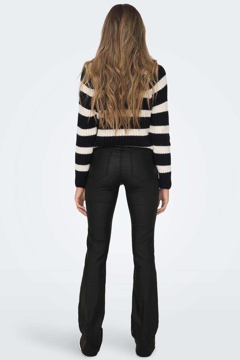 Deze zwarte flared broek van Only is een veelzijdige en stijlvolle keuze voor je garderobe. Gemaakt van een comfortabele mix van viscose, nylon en elastan, biedt deze broek een zachte pasvorm die de hele dag door fijn aanvoelt. De flared snit geeft een trendy uitstraling, terwijl de coating een subtiele glans toevoegt, perfect voor een casual maar chique look. De broek heeft een regular waist en een 5-pocket design, wat praktisch is voor dagelijks gebruik. Dankzij de knoop- en ritssluiting kun je de broek makkelijk aan- en uittrekken.