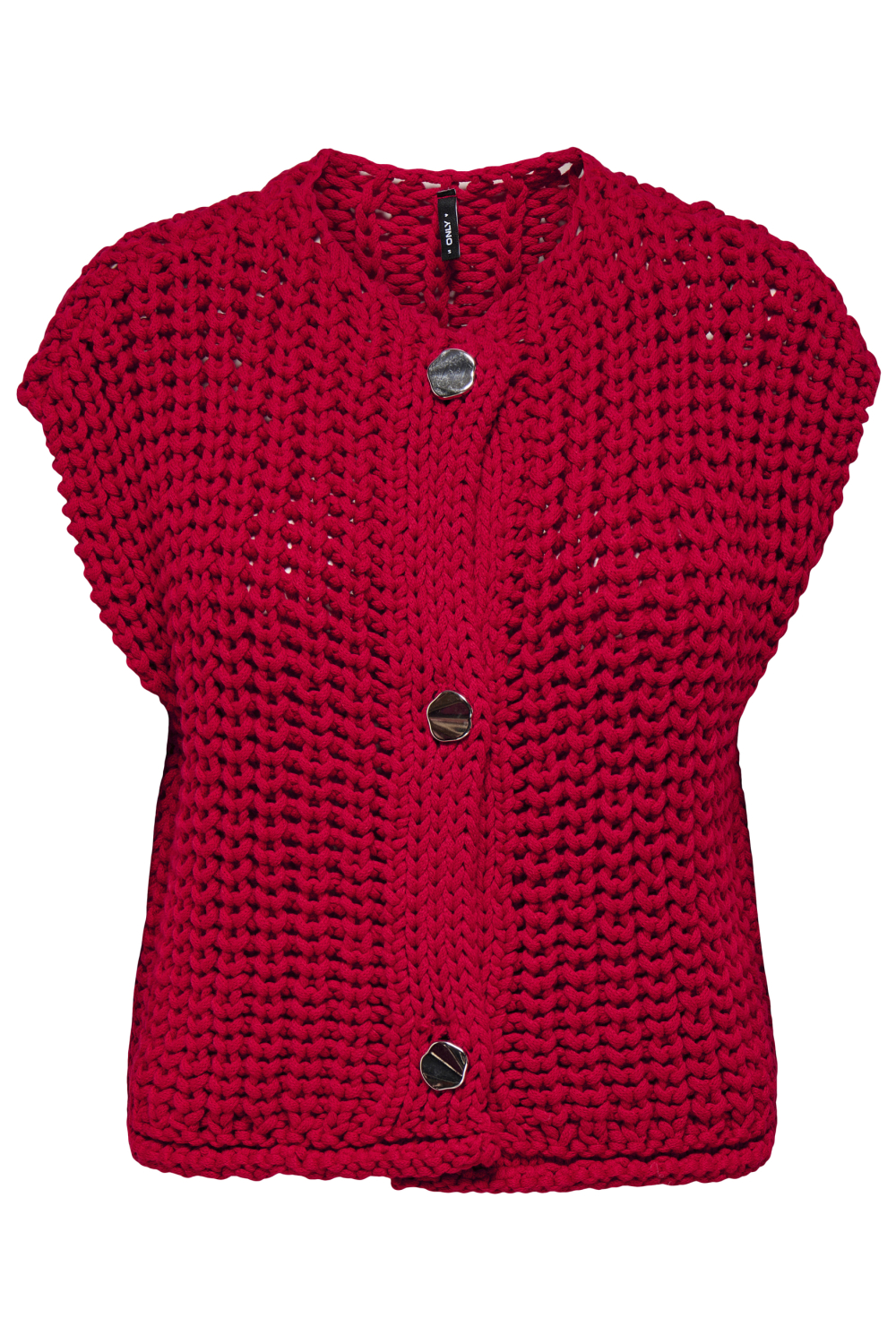 Dit rode damesgilet van Only is een veelzijdige toevoeging aan je wintergarderobe. Gemaakt van 100% acryl, biedt het een aangenaam warme en comfortabele stof. De regular fit pasvorm zorgt voor een relaxed gevoel, terwijl de opvallende, ronde hals en een sluiting met grote zilverkleurige knopen een moderne uitstraling geven. De grof gebreide structuur in de kleur ‘Salsa’ voegt textuur en diepte toe, perfect voor casual settings.
