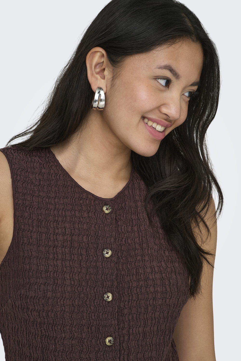 Dit elegante gilet van Only in de kleur Deep Mahogany is een stijlvolle aanvulling op je garderobe. Gemaakt van 98% gerecycled polyester en 2% elastaan, biedt het comfort en een goede pasvorm door de regular fit. De structuur in de stof geeft het een unieke uitstraling, terwijl de knoopsluiting en de ronde hals voor een verfijnd detail zorgen. Het mouwloze ontwerp maakt dit gilet perfect voor zowel warmere dagen als voor een trendy laagjeslook. Dit gilet is een veelzijdige keuze die moeiteloos past binnen een casual stijl. Combineer het met een eenvoudige jeans voor een ontspannen dagje uit, of geef je zakelijke outfit een moderne twist door het te dragen over een blouse. De diepe mahonie kleur laat zich makkelijk matchen met verschillende tinten, waardoor het een basisstuk is dat je keer op keer kunt dragen. Of je nu naar een casual lunch gaat of een informele bijeenkomst hebt, met dit gilet ben je altijd goed gekleed.