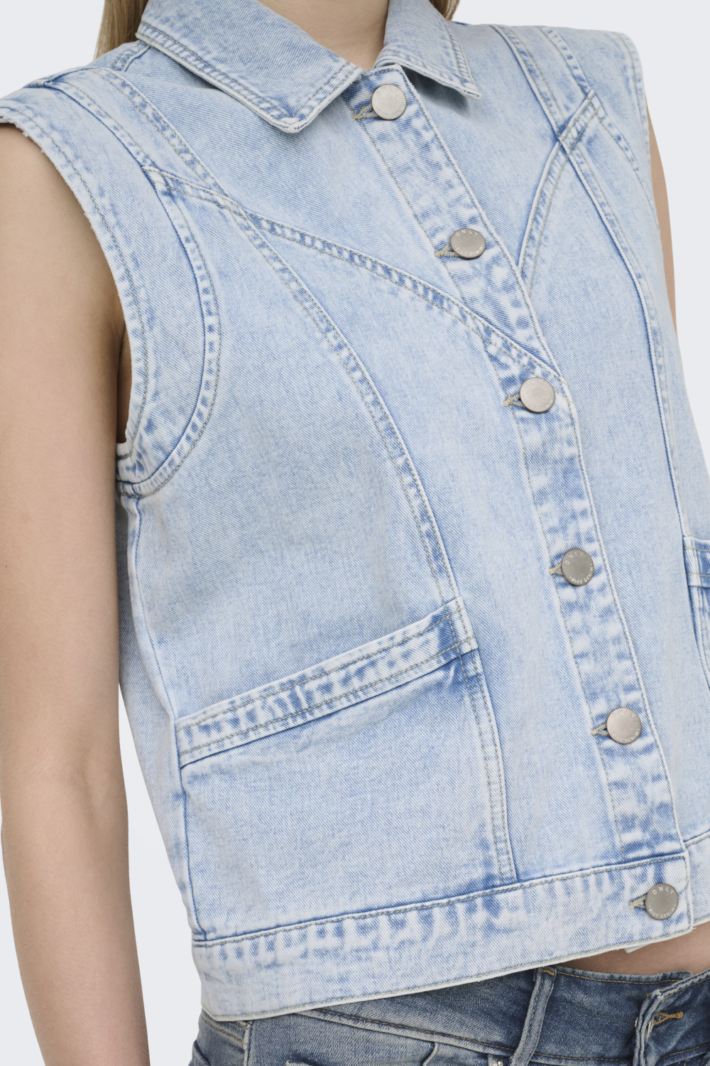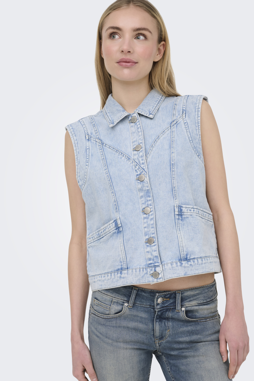 Dit denim gilet van Only is een veelzijdige en modieuze toevoeging aan je lente garderobe. Met een stonewash afwerking en een puntkraag straalt het gilet een tijdloze stijl uit. De knoopsluiting en de regular fit pasvorm geven een klassieke look die bij diverse outfits past. Het is ontworpen zonder mouwen, waardoor het perfect is voor warme seizoenen en gemakkelijk te combineren met zowel lange als korte mouwen. Het gebruik van 100% katoen zorgt voor een luchtige en comfortabele draagervaring, ideaal voor casual dagen en ontspannen wandelingen. Dankzij de ingetogen paspelzakken en de normale lengte kan dit Only gilet eenvoudig gestyled worden voor verschillende gelegenheden. Ga voor een casual look door het te dragen met een effen T-shirt en een lichte jeans, of voeg een speelse touch toe aan een jurk. Of je nu een dagje uit plant of naar een informele bijeenkomst gaat, dit gilet biedt een stijlvolle keuze die jou helpt een eigen draai aan je outfit te geven.