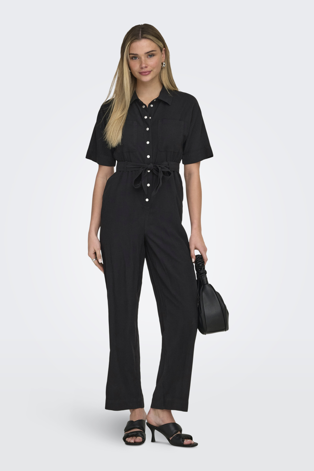 Deze casual zwarte damesjumpsuit van Only is de perfecte toevoeging aan je zomergarderobe. Met een regular pasvorm en korte mouwen biedt dit kledingstuk zowel comfort als stijl. De jumpsuit is voorzien van een puntkraag en een handige drukknoopsluiting, waardoor je in een handomdraai klaar bent voor elke gelegenheid. De elegante tailleband accentueert je silhouet op een subtiele manier. Dankzij de normale lengte en praktische steekzakken is deze jumpsuit een ideale keuze voor diverse zomerse activiteiten. Of je nu een dagje aan het strand doorbrengt of een avondje uitgaat, met deze jumpsuit van Only zie je er altijd goed uit. De tijdloze zwarte kleur maakt combineren eenvoudig; draag hem met sandalen voor een relaxte look of met hakken voor een chic effect. De duurzame materialen zorgen bovendien voor een lange levensduur, zodat je er keer op keer van kunt genieten.