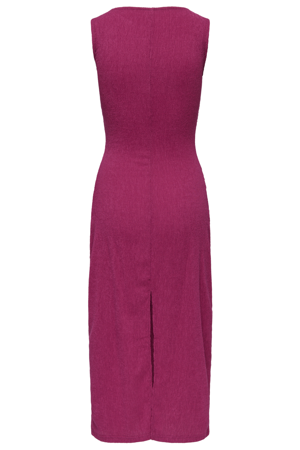 Deze casual zomerjurk van Only in een levendige Sangria tint is een elegante aanvulling op je garderobe. De jurk heeft een moderne slim fit pasvorm die je figuur prachtig accentueert. Dankzij de zachte mix van 79% polyester, 20% viscose, en 1% elastaan, voelt de jurk comfortabel aan op de huid en biedt het voldoende elasticiteit voor een perfecte pasvorm. De lange lengte geeft het kledingstuk een stijlvolle uitstraling, terwijl de mouwloze afwerking het perfect maakt voor warme zomerdagen. De ronde hals en subtiele plooien aan de voorkant voegen een verfijnde touch toe aan deze veelzijdige jurk. Met deze Only jurk ben je klaar voor elke gelegenheid, of je nu een casual dagje uit hebt gepland of een zomerse avondbijeenkomst hebt. De split aan de achterkant zorgt voor bewegingsvrijheid en geeft een speelse touch aan het geheel. Combineer de jurk met sandalen voor een ontspannen look, of voeg een paar elegante hakken toe voor een meer formele setting. Of je nu naar een feestje gaat of gewoon geniet van een zonnige dag, deze jurk biedt je een moderne en comfortabele keuze.