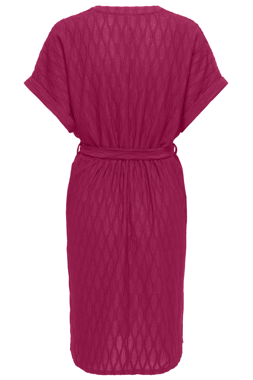 Deze casual jurk van Only biedt een stijlvolle en ontspannen toevoeging aan je zomercollectie. Uitgevoerd in een warme Sangria kleur en gemaakt van 98% polyester en 2% elastaan, heeft de jurk een lichte stretch die zorgt voor een comfortabele pasvorm. Het karakteristieke patroon en de luchtige structuur voegen een subtiele, maar toch opvallende uitstraling toe aan het ontwerp. De V-hals en kapmouwen geven een speelse twist aan het geheel, en de bijpassende tailleband creëert een elegante silhouet.