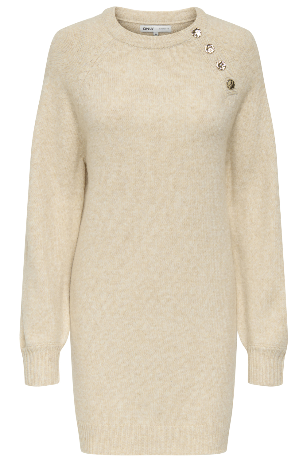 Deze stijlvolle gebreide jurk van Only is een veelzijdige aanvulling voor je herfstgarderobe. De gemêleerde beige kleur en ronde hals geven een subtiele en moderne tint aan dit kledingstuk. De jurk heeft een regular fit en is gemaakt van een duurzame mix van 50% acryl en 50% gerecycled polyester, wat zorgt voor een comfortabele en milieubewuste keuze. Aan de schouder vind je vier decoratieve gouden knopen die het geheel een verfijnd accent geven.