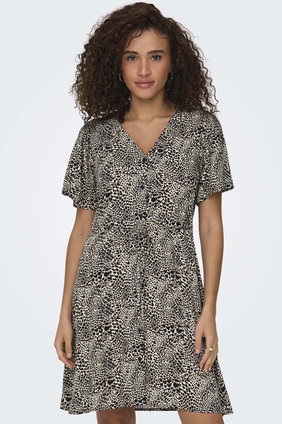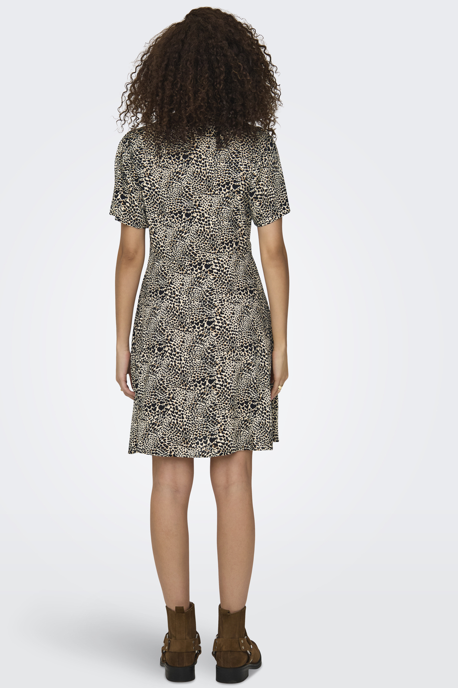 Deze casual jurk van Only is een veelzijdige toevoeging aan je garderobe. Het speelse animal patroon in de tint PUMICE STONE/ALMA HEART geeft een dynamische touch aan je look. De jurk is gemaakt van 100% viscose, waardoor hij soepel valt en comfortabel aanvoelt op de huid. De regular fit en korte mouwen zorgen voor een luchtige stijl, ideaal voor zowel dagelijkse uitstapjes als informele gelegenheden. De jurk heeft een flatterende V-hals en sluit met knopen aan de voorkant, waardoor je moeiteloos kunt variëren in stijl. De korte lengte maakt hem perfect voor warmer weer, en kan makkelijk gecombineerd worden met sandalen of laarzen voor een complete outfit. Of je nu een dagje in de stad doorbrengt of een ontspannen middag met vrienden hebt gepland, deze jurk biedt je de perfecte balans tussen stijl en comfort. Meer informatie: De totale lengte van de jurk is 89 cm bij maat S.