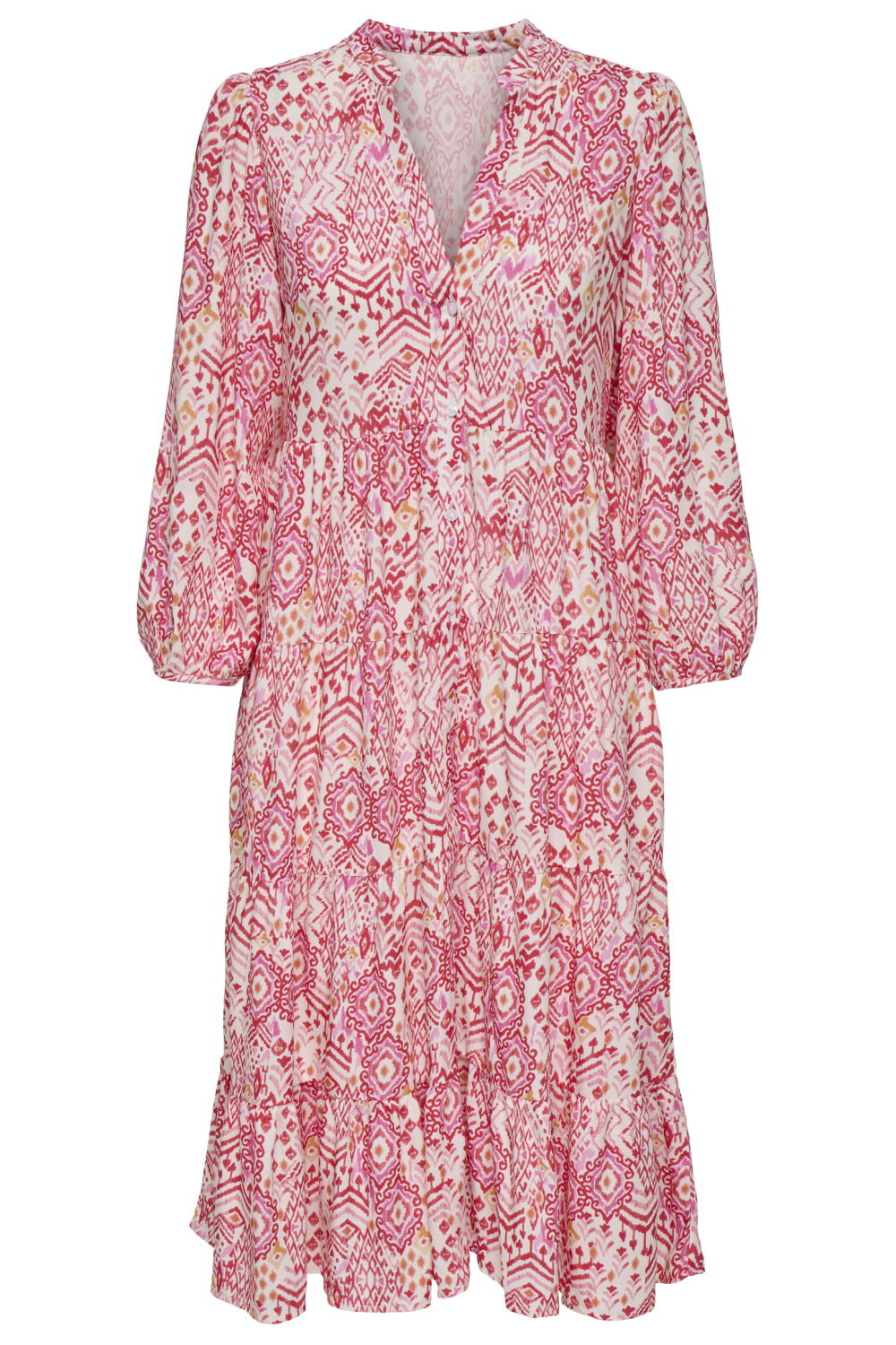 De jurk van Only is een levendige aanvulling op je garderobe en biedt een eigentijdse uitstraling met zijn grafische patroon in zachte roze tinten. De regular fit pasvorm en de 7/8 lengte zorgen voor een comfortabele, stijlvolle look die zich aanpast aan elke casual gelegenheid. Deze jurk heeft een speelse v-hals en een knoopsluiting die het geheel een subtiele touch geeft, perfect voor een ontspannen dagje uit of een informele bijeenkomst. Gemaakt van 100% viscose, voelt de jurk licht en luchtig aan, ideaal voor elk seizoen. De 7/8 mouwlengte voegt een extra stijlvol element toe zonder afbreuk te doen aan comfort. Deze jurk is een uitstekende keuze voor dagelijkse activiteiten of een weekenduitje. Combineer hem met eenvoudige accessoires voor een elegante alledaagse look. Kies voor comfort en stijl met deze veelzijdige jurk van Only. Meer informatie: De totale lengte is 110 cm bij maat S.