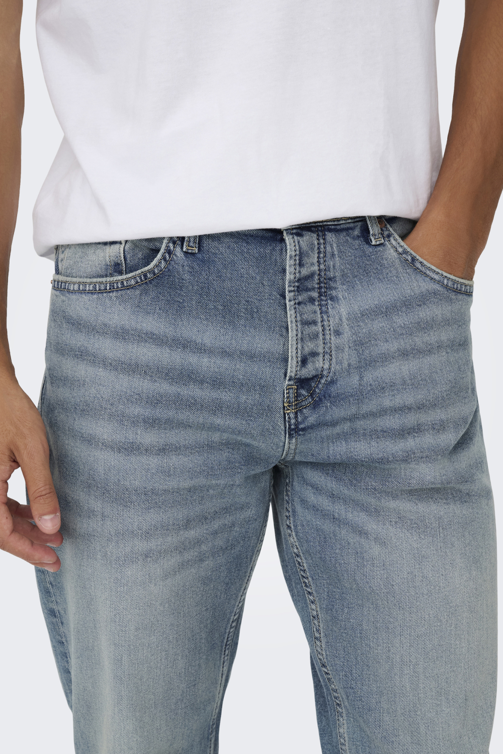 Deze Only & Sons jeans in een lichte blauwe denim is een veelzijdige toevoeging aan je wintergarderobe. Met een straight fit en een regular waist biedt hij een klassieke en comfortabele pasvorm. De verfijnde used washed look geeft de jeans een authentieke uitstraling, waardoor hij perfect is voor zowel casual als meer geklede gelegenheden. De 5-pocketstijl zorgt voor een praktische en stoere touch, terwijl de knoopsluiting een tijdloze stijl toevoegt. De denim is ontworpen om mee te gaan met de trends, zonder in te boeten op comfort. Combineer deze jeans met een simpel T-shirt voor een relaxte weekendlook, of draag hem met een net jasje voor een casual zakelijke bijeenkomst. De normale lengte maakt het mogelijk om hem eenvoudig te stylen met verschillende soorten schoenen. Of je nu een dagje uit gaat of een avondje uit plannen hebt, deze jeans past zich moeiteloos aan aan jouw stijl.