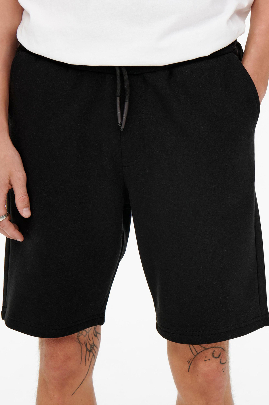 Deze relaxed fit korte broek van Only & Sons is een ideale keuze voor comfortabele vrijetijdskleding. Gemaakt van een zachte mix van 67% polyester en 33% katoen, biedt deze zwarte lounge short een fijne combinatie van comfort en duurzaamheid. De elastische boord met een trekkoord geeft een perfecte pasvorm en maakt het eenvoudig om de short naar wens aan te passen. Dankzij de steekzakken aan de zijkanten heb je altijd een plek voor je essentials. Met zijn normale lengte en regular waist pasvorm, is deze sweatstof short veelzijdig genoeg voor diverse gelegenheden. Draag deze short tijdens een ontspannen dag thuis of combineer hem met een eenvoudig T-shirt en sneakers voor een casual look tijdens een zomeruitje. Of je nu naar het strand gaat of een relaxte dag in het park hebt gepland, deze Only & Sons korte broek is een praktische en modieuze keuze die altijd van pas komt in je garderobe.