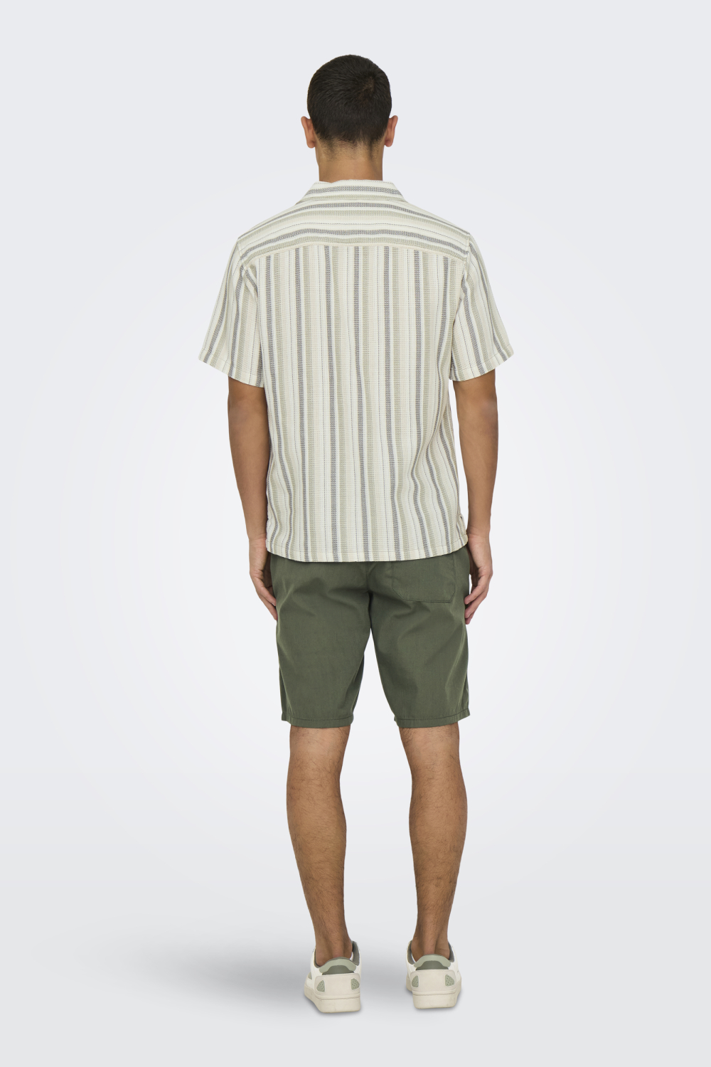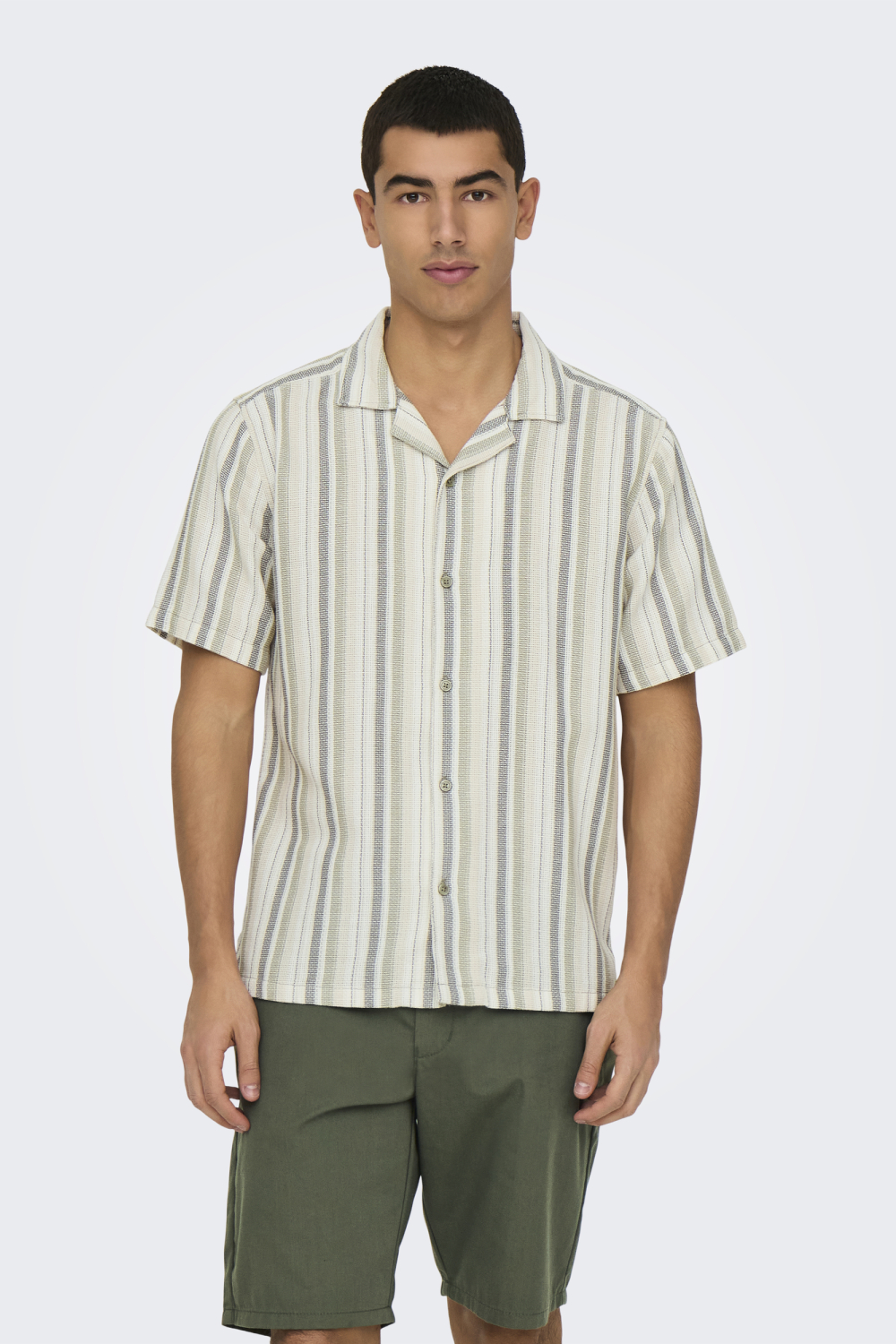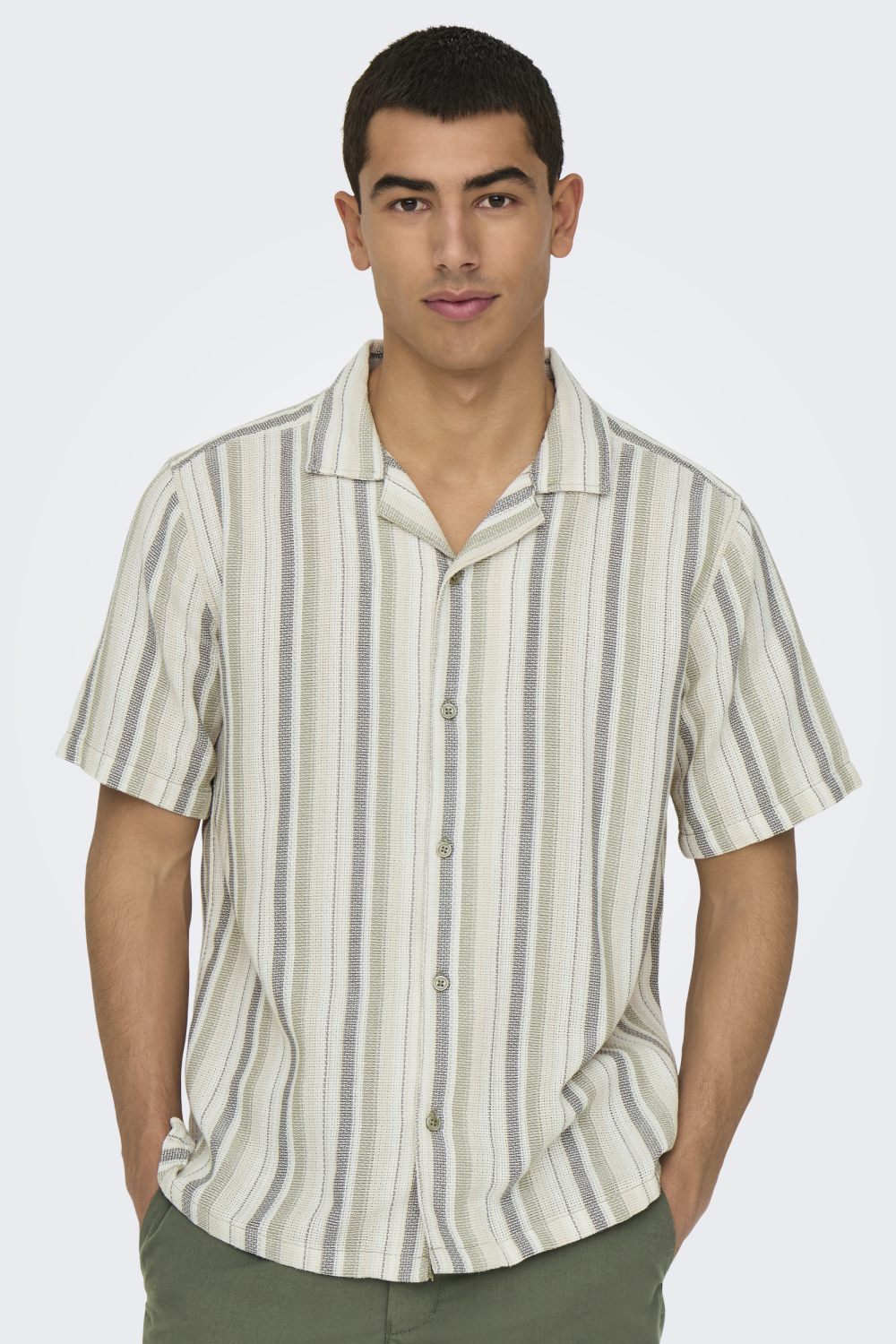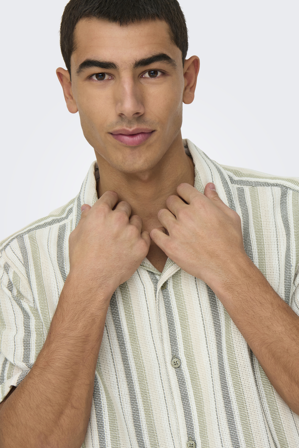 Dit casual gestreepte overhemd van Only & Sons is een veelzijdige toevoeging aan je garderobe. Met een regular fit en een eigentijdse puntkraag, straalt dit overhemd een nonchalante stijl uit die zowel comfortabel als stijlvol is. De subtiele beige en grijsgroene strepen zorgen voor een frisse uitstraling die ideaal is voor dagelijkse activiteiten. Dankzij de korte mouwen is dit overhemd perfect om te dragen tijdens warme dagen of informele gelegenheden. Gemaakt van duurzame materialen, past dit Only & Sons overhemd gemakkelijk in je dagelijkse stijl. Combineer het met een lichtgekleurde jeans voor een ontspannen look, of kies voor een donkere broek voor een iets formelere uitstraling. Of je nu een dagje uit plant of gewoon lekker thuis blijft, dit overhemd biedt het comfort en de veelzijdigheid die je nodig hebt. Een uitstekende keuze voor die zomerse dagen als je iets luchtigs en stijlvols wilt dragen.