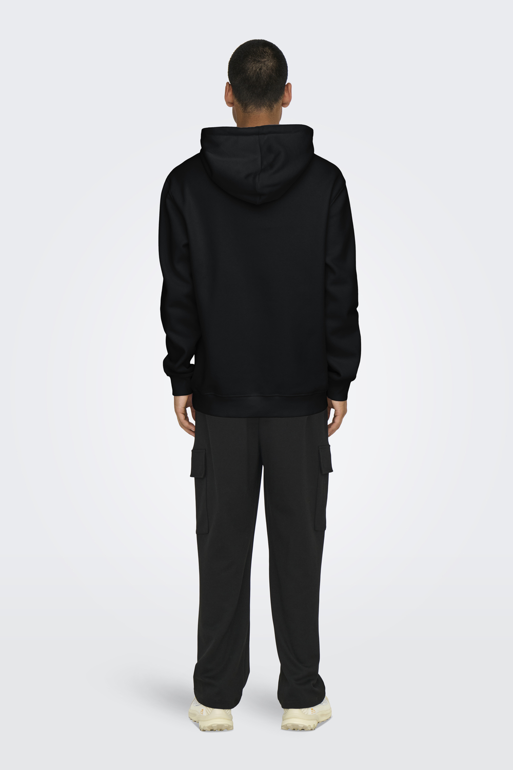 Deze zwarte sweater van Only & Sons is een fijne toevoeging aan jouw casual garderobe. Met zijn regular pasvorm biedt het comfort zonder in te boeten op stijl. De capuchon en lange mouwen maken deze trui ideaal voor koelere dagen. Gemaakt van een kwalitatieve mix van 65% katoen en 35% polyester, voelt de sweatstof zacht aan op de huid. De subtiele tekstprint op de borst geeft een eigentijds accent aan het ontwerp. Perfect voor uiteenlopende informele gelegenheden, van een ontspannen dag thuis tot een middagje in de stad. De sweater beschikt over handige steekzakken, zodat je eenvoudig je handen warm kunt houden of kleine essentials bij de hand hebt. Combineer hem met een jeans voor een moeiteloze look of draag hem over een T-shirt voor extra warmte. Met zijn tijdloze ontwerp en praktische details is deze trui een veelzijdige keuze voor dagelijks gebruik.
