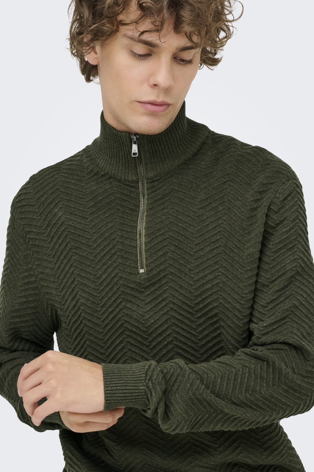 De Only & Sons trui in Olive Night/Melange is een veelzijdige keuze voor jouw herfstgarderobe. Deze regular fit trui is gemaakt van 100% katoen en biedt een mix van stijl en comfort. Met een modern zigzagpatroon en een high neck met rits, geeft deze trui je een subtiele, modieuze uitstraling. Of je nu naar je werk gaat of een informele bijeenkomst hebt, deze trui past perfect bij diverse gelegenheden. Dankzij de normale lengte en lange mouwen biedt de trui zowel bescherming tegen het weer als bewegingsvrijheid. De hoge kraag met ritssluiting zorgt voor extra warmte op koudere dagen. Combineer deze knitwear trui met je favoriete jeans voor een casual look, of draag hem onder een blazer voor een iets formelere Engelse stijl. Deze trui van Only & Sons is een ideale match voor wie houdt van subtiele details gecombineerd met alledaags draagcomfort.