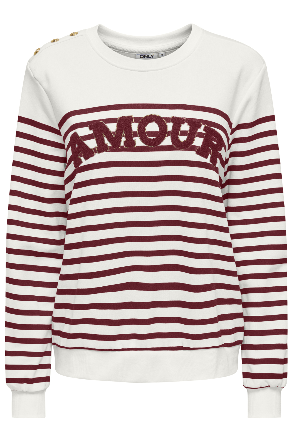 Deze casual sweater van Only is een perfecte mix van comfort en stijl voor de herfst. Met de opvallende Bordeauxrode strepen op een witte achtergrond en het woord "AMOUR" in reliëf op de borst, krijgt deze sweater een speelse maar modieuze uitstraling. Gemaakt van een zachte blend van 60% katoen en 40% polyester, biedt het een comfortabele regular fit die ideaal is voor dagelijks gebruik. De ronde halslijn en lange mouwen maken deze sweater een veelzijdige keuze voor verschillende gelegenheden.
