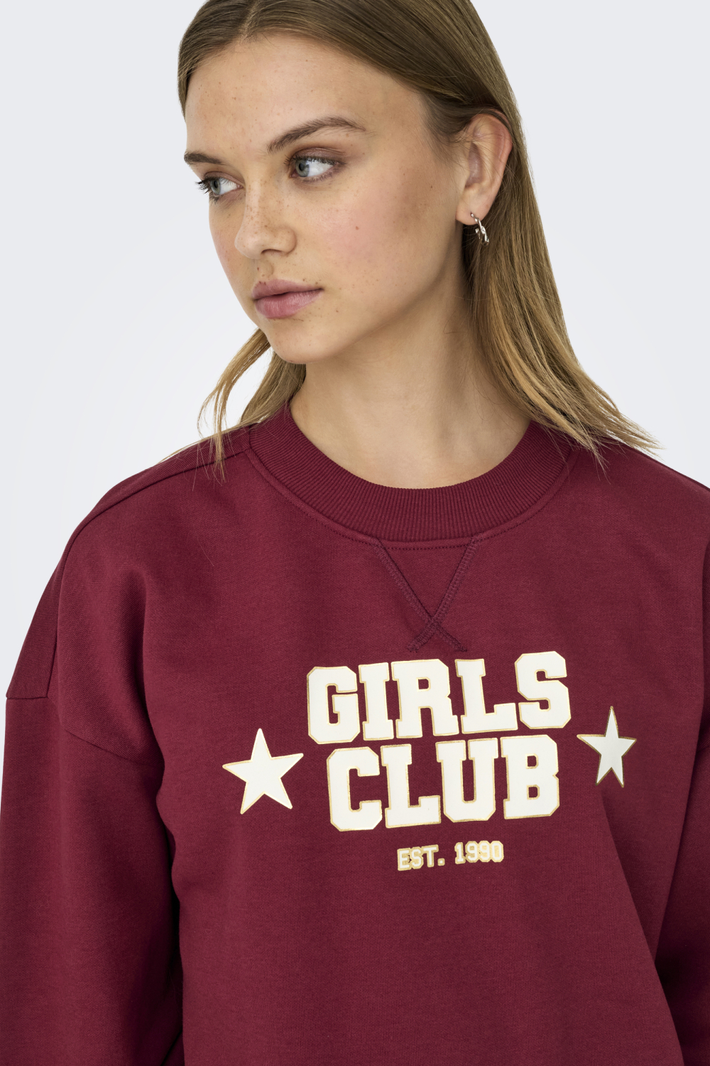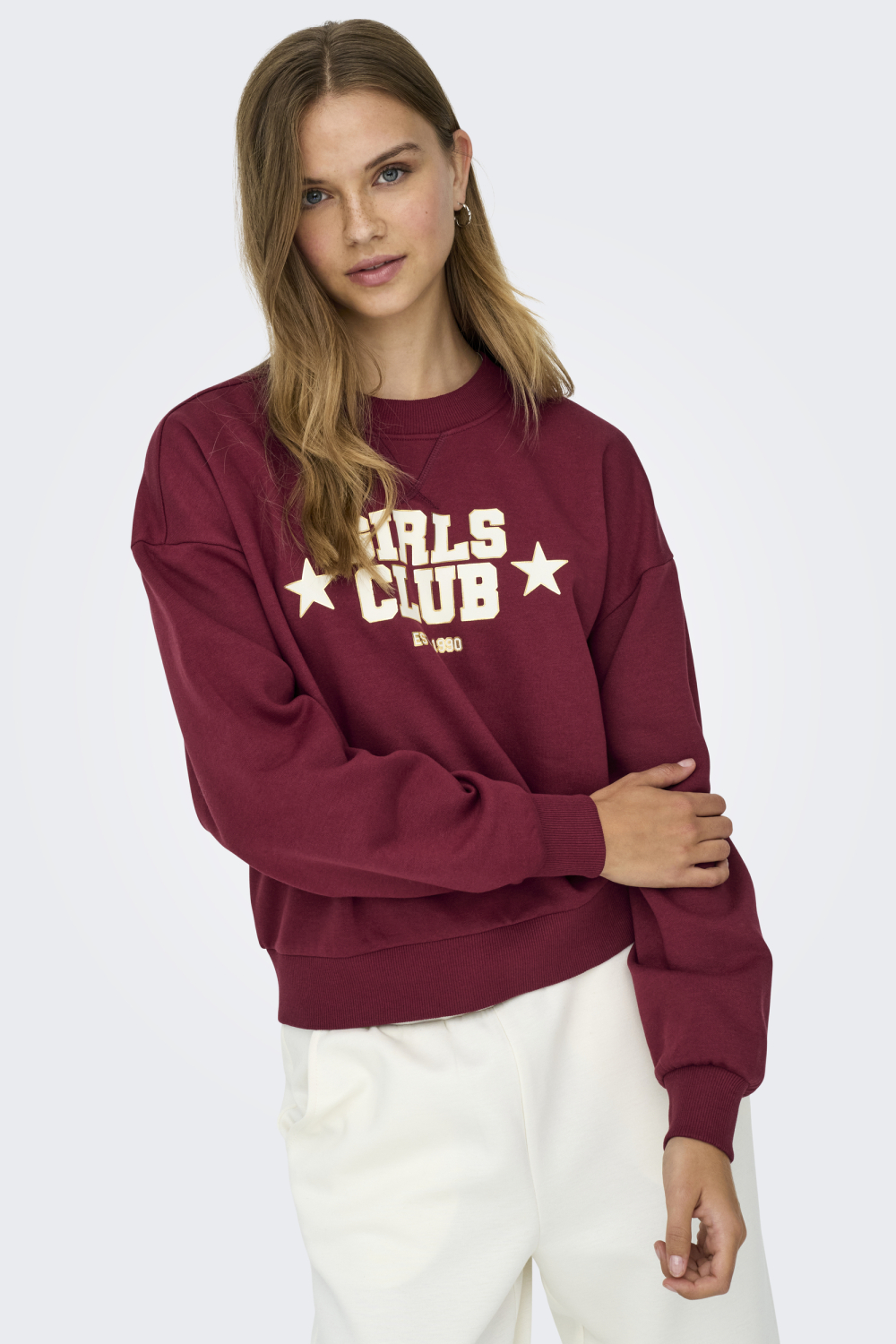 Deze comfortabele sweater van Only is de perfecte aanvulling op je wintergarderobe. Gemaakt van een zachte mix van 60% katoen en 40% polyester, voelt de sweatstof heerlijk aan op je huid. De bordeauxrode kleur met opvallende witte tekst "GIRLS CLUB" maakt deze trui tot een echte blikvanger. De regular fit en de lange mouwen zorgen voor een casual uitstraling die ideaal is voor ontspannen dagen en comfortabele avonden thuis.