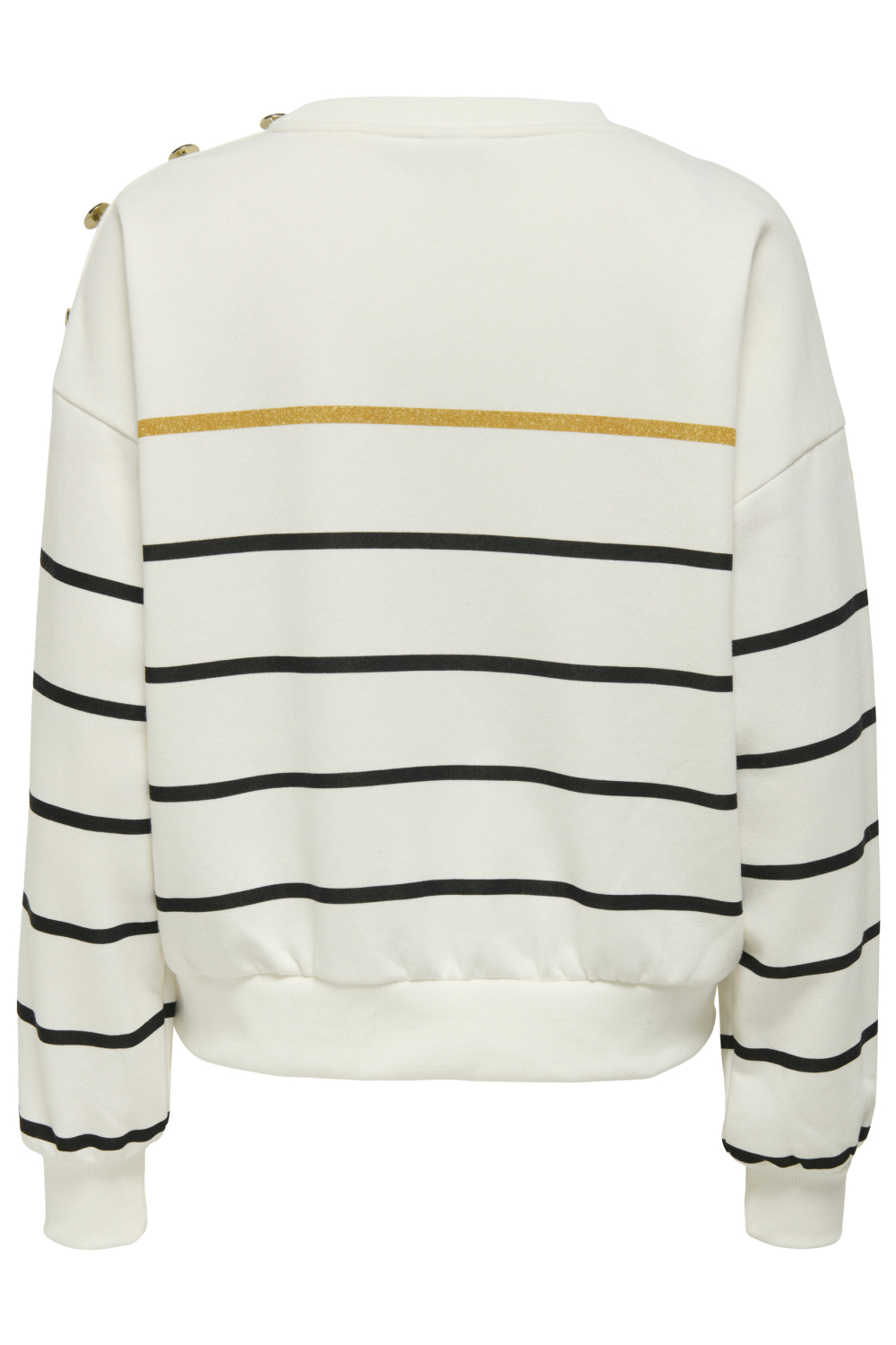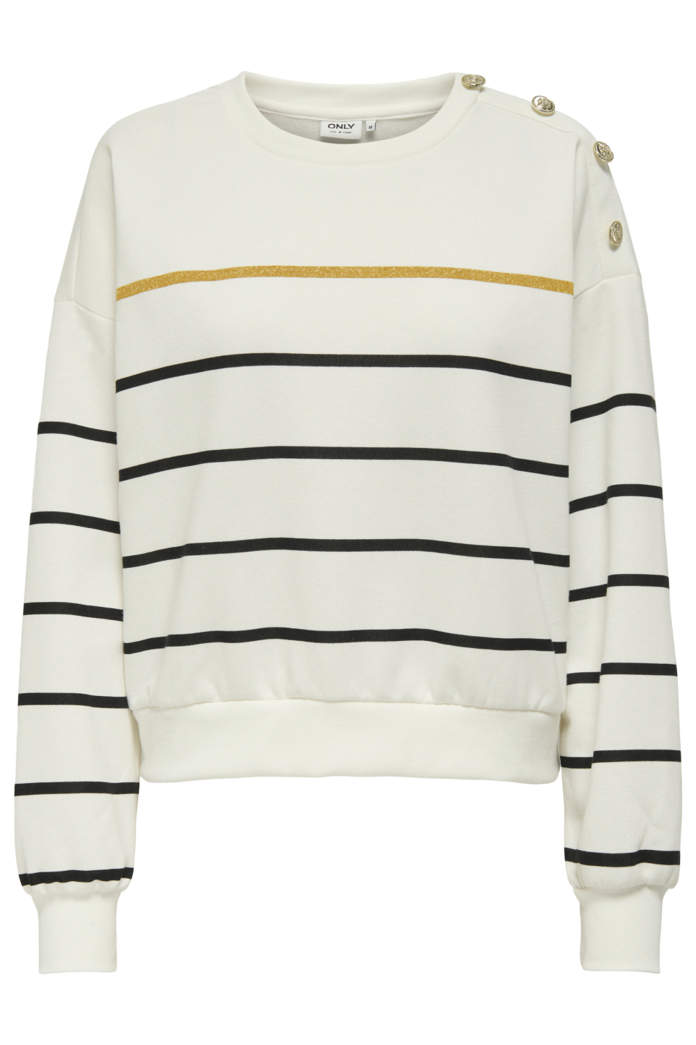 Deze casual sweater van Only, in de kleur Cloud Dancer, is een stijlvolle keuze voor de herfst. De regular fit zorgt voor een comfortabele pasvorm, terwijl de mix van katoen en polyester de trui zacht en duurzaam maakt. Met een moderne ronde hals en lange mouwen is het ideaal voor dagelijks gebruik. De horizontale strepen gecombineerd met een subtiele gouden lijn geven een speelse twist aan dit kledingstuk. De knoopdetails op de schouder voegen een uniek accent toe dat je look direct opfleurt.