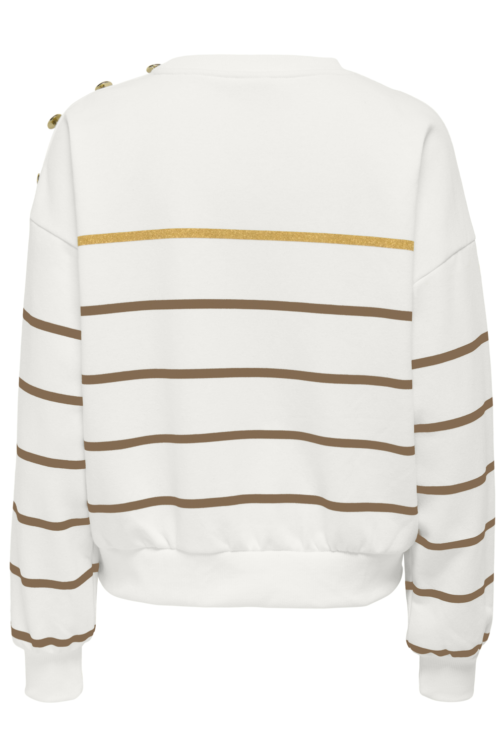 Deze casual sweater van Only is een perfecte aanvulling op je herfstgarderobe. Met een eigentijds streepjespatroon in wit en bruine tinten, krijgt deze sweater een frisse uitstraling. De gouden glitterstreep voegt een subtiel vleugje glamour toe. Dankzij de regular fit pasvorm voel je je comfortabel, terwijl de ronde hals en de opvallende knoopdetails op de schouder de trui een speelse twist geven. Gemaakt van een ademende mix van 60% katoen en 40% polyester, is deze sweater ideaal voor dagelijks gebruik.