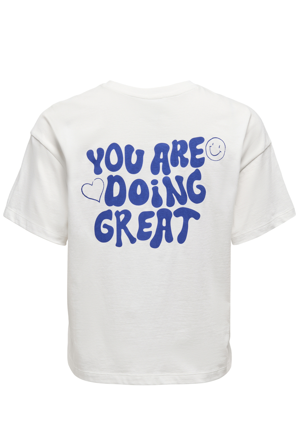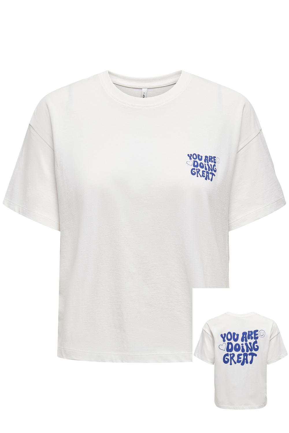 Dit dames T-shirt van Only is een fijne aanwinst voor je zomergarderobe. Het heeft een relaxte regular fit en is uitgevoerd met een speels tekstpatroon in opvallend blauw op zowel de voor- als achterkant. De subtiele ronde hals en de korte mouwen zorgen voor een luchtige en stijlvolle look, ideaal voor dagelijks gebruik of een ontspannen dagje uit. Gemaakt van 100% biologisch katoen, biedt dit T-shirt een duurzaam en comfortabel draaggevoel. Het is perfect voor casual ontmoetingen of een ontspannen wandeling in het park. De frisse kleur genaamd Cloud Dancer/Great geeft het T-shirt een lichte en speelse uitstraling, waardoor het makkelijk te combineren is met je favoriete shorts of jeans. Stap stijlvol en zelfverzekerd de deur uit met dit veelzijdige en charmante kledingstuk.