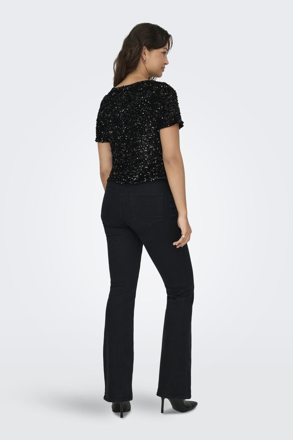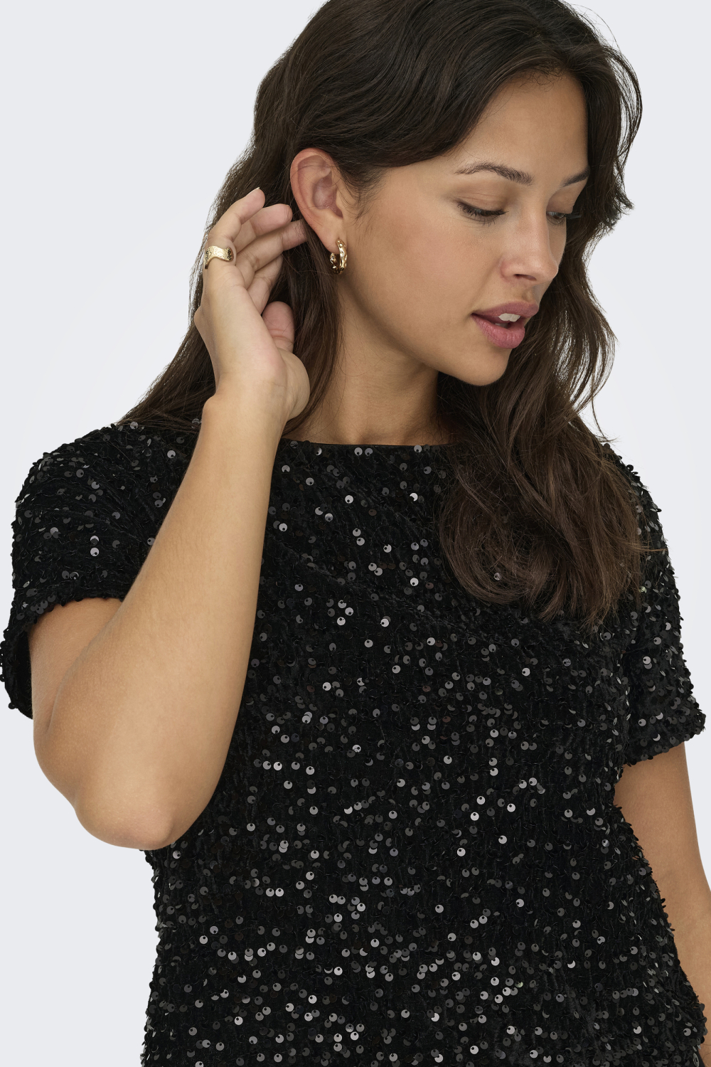 Dit elegante zwarte T-shirt van Only is een onweerstaanbare keuze voor je feestelijke garderobe. De prachtige pailletten zorgen voor een schitterend effect, perfect voor een avondje uit of een speciale gelegenheid. Met een boothals ontwerp en korte mouwen straalt dit T-shirt eenvoud en stijl uit. Gemaakt van 100% polyester, voelt het materiaal soepel aan op je huid en biedt het een comfortabele draagervaring.