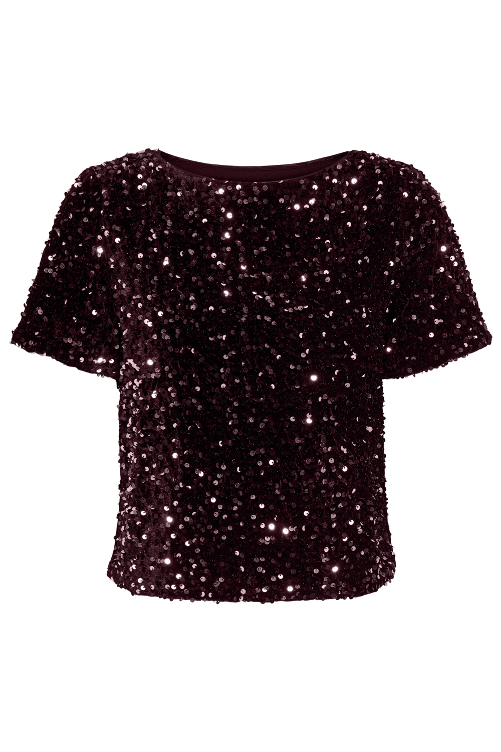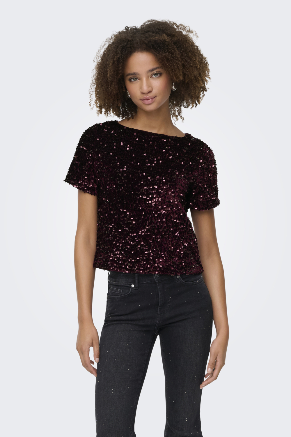 Dit schitterende T-shirt van Only is een echte blikvanger voor je garderobe. De donkerpaarse kleur met paillettenpatroon springt meteen in het oog en zorgt voor een glamoureuze uitstraling. Het heeft een klassieke boothals waarbij de korte mouwen de elegante look compleet maken. Gemaakt van 100% polyester, biedt het een lichtgewicht en comfortabele draagervaring voor tijdens feestelijke gelegenheden.