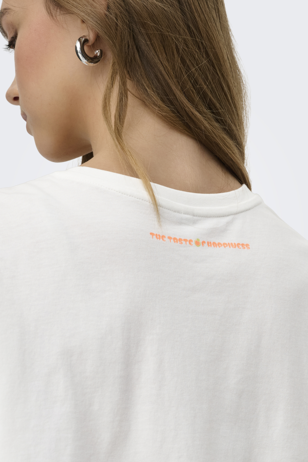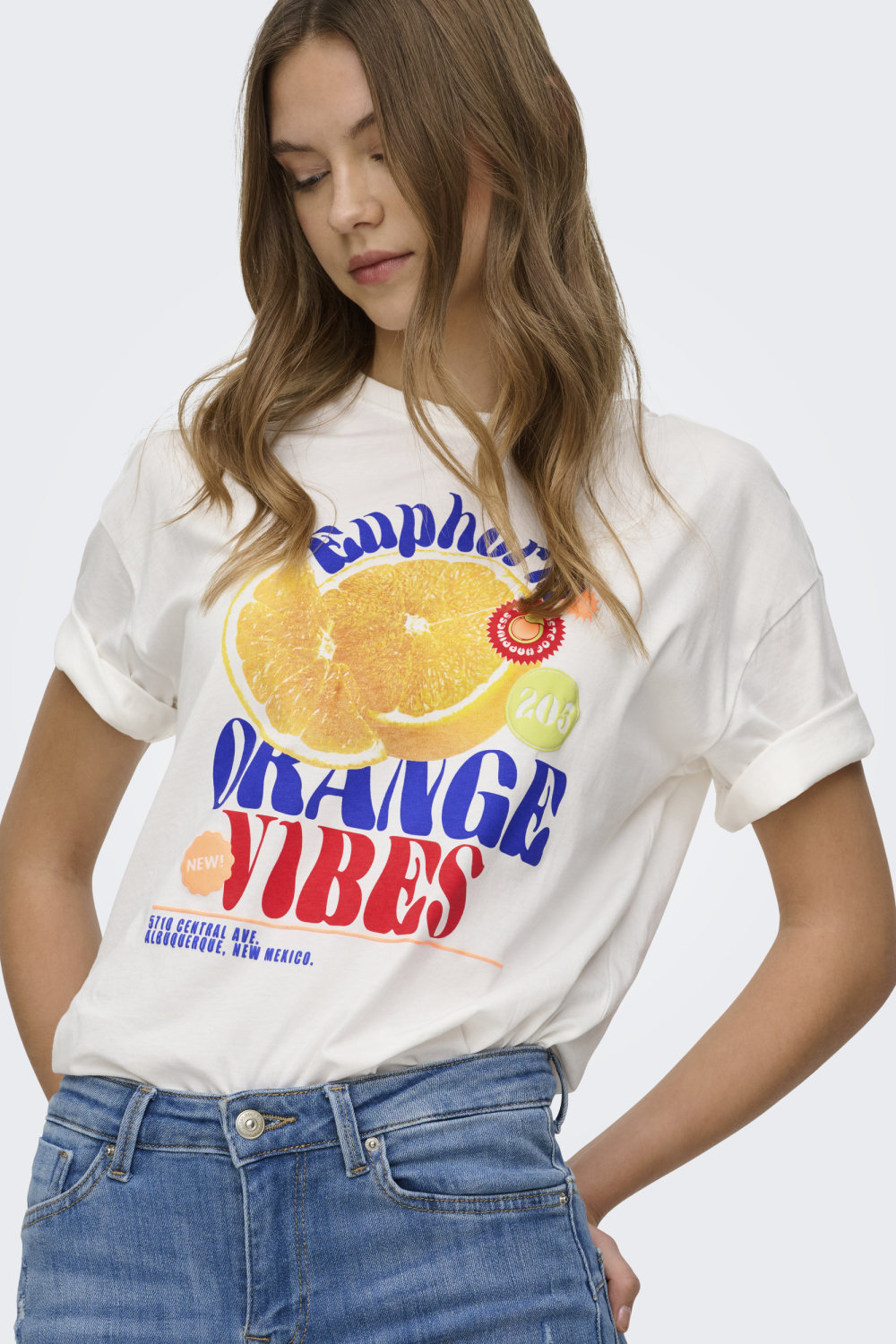Dit casual dames T-shirt van Only is een frisse toevoeging aan je lente garderobe. Het witte shirt is gemaakt van 100% katoen, en biedt daarmee een comfortabele en ademende ervaring. Met een opvallend printpatroon op de voorkant, met de tekst “Euphoria Orange Vibes”, straalt het T-shirt een speelse energie uit. De ronde halslijn en de regular fit pasvorm maken het gemakkelijk draagbaar voor dagelijks gebruik. Perfect voor casual uitstapjes, een dagje winkelen of een relaxte middag in het park. De korte mouwen maken dit T-shirt ideaal voor warmere dagen, terwijl de normale lengte ervoor zorgt dat het moeiteloos te combineren is met zowel jeans als shorts. Het ontwerp trekt de aandacht zonder te overheersen, waardoor je het kunt dragen in verschillende informele settings. Of je nu onderweg bent naar een gezellige brunch of een dagje op het terras doorbrengt, dit Only T-shirt is een veelzijdige keuze voor een relaxte, modieuze look.