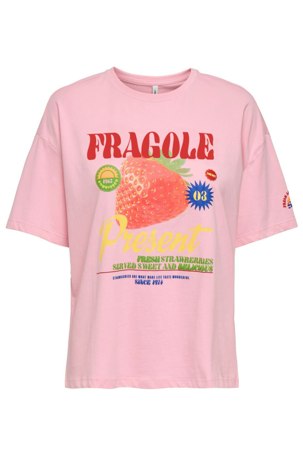 Dit casual dames T-shirt van Only is een vrolijke aanvulling voor je garderobe. Met een opvallend fruitpatroon op een roze achtergrond, springt het echt in het oog. De iconische "Fragole" opdruk en de kleurrijke aardbeienprint geven het shirt een speels karakter dat perfect past bij een ontspannen lentestijl. Gemaakt van 100% katoen, biedt dit T-shirt een luchtige en comfortabele ervaring, ideaal voor warme dagen. Met zijn regular fit en ronde hals is het T-shirt zowel stijlvol als tijdloos, en het is eenvoudig te combineren met verschillende outfits. Draag het met een lichte jeans voor een casual dagje uit, of kies voor een rok voor een iets formelere look. De korte mouwen en normale lengte maken het een veelzijdige keuze die je moeiteloos aan je dagelijkse garderobe kunt toevoegen. Dit Only T-shirt biedt een verfrissende uitstraling die perfect is voor een voorjaarswandeling of een gezellige brunch.