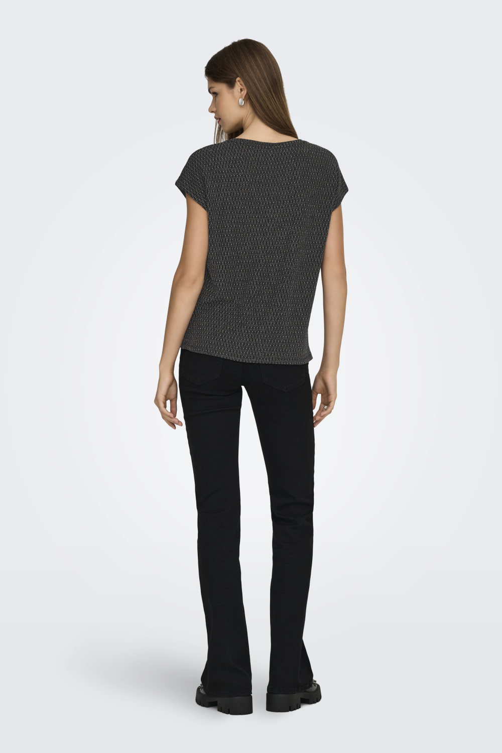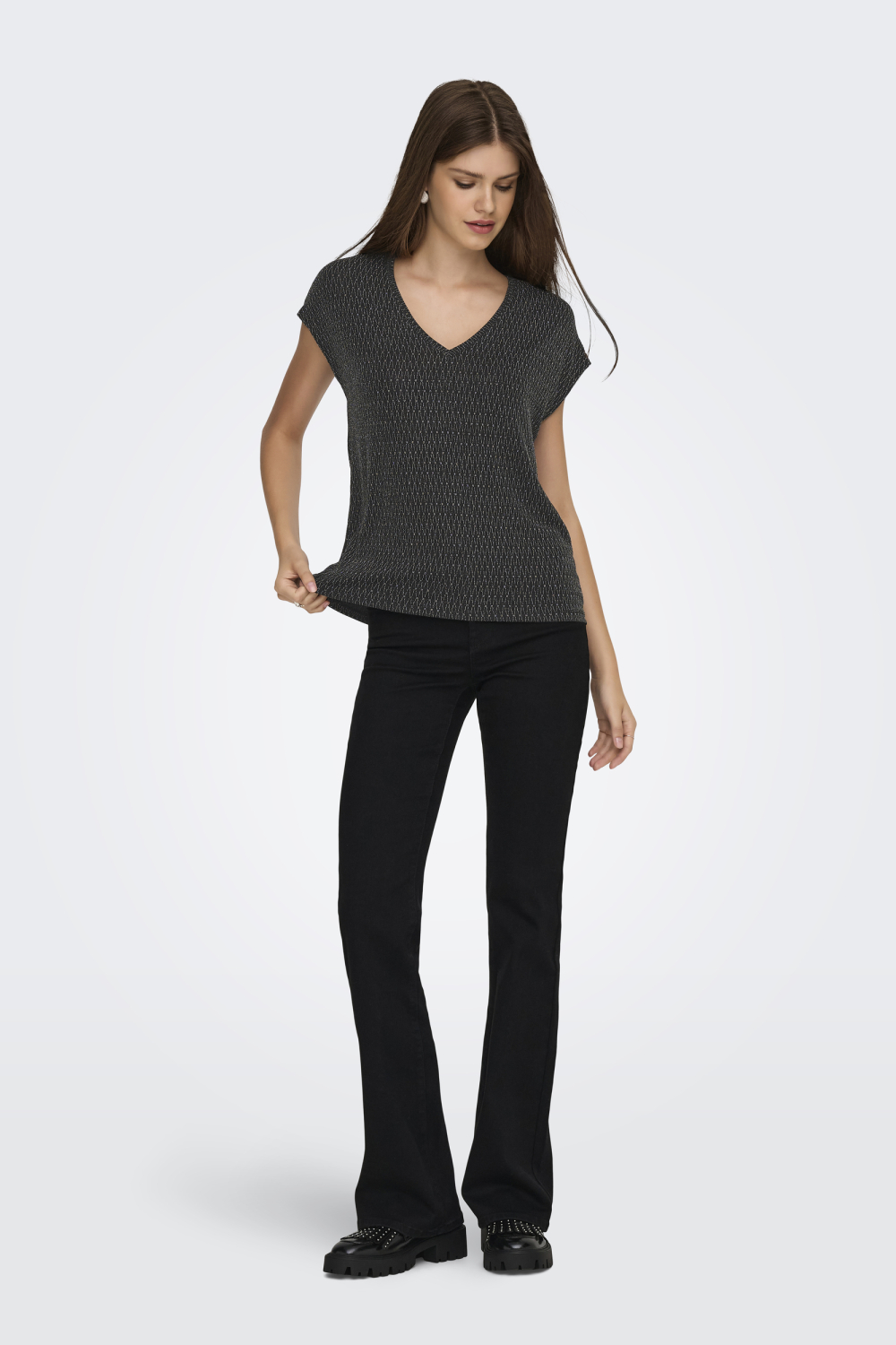 Dankzij het glinsterende patroon is dit Only T-shirt een uitstekende keuze voor een avondje uit, maar het werkt net zo goed voor een ontspannen lunch met vrienden. De normale lengte maakt het ideaal om te dragen op een jeans of een nette pantalon, afhankelijk van de gelegenheid. Met dit T-shirt blijf je stijlvol en zelfverzekerd, of je nu een casual dagje hebt gepland of iets speciaals op de agenda staat.