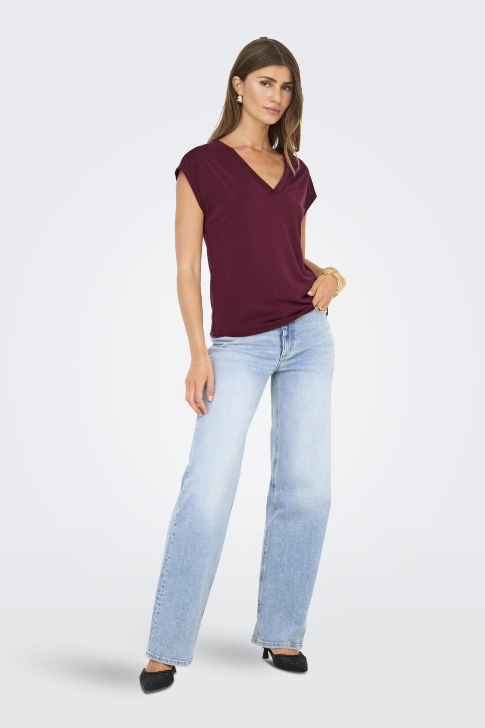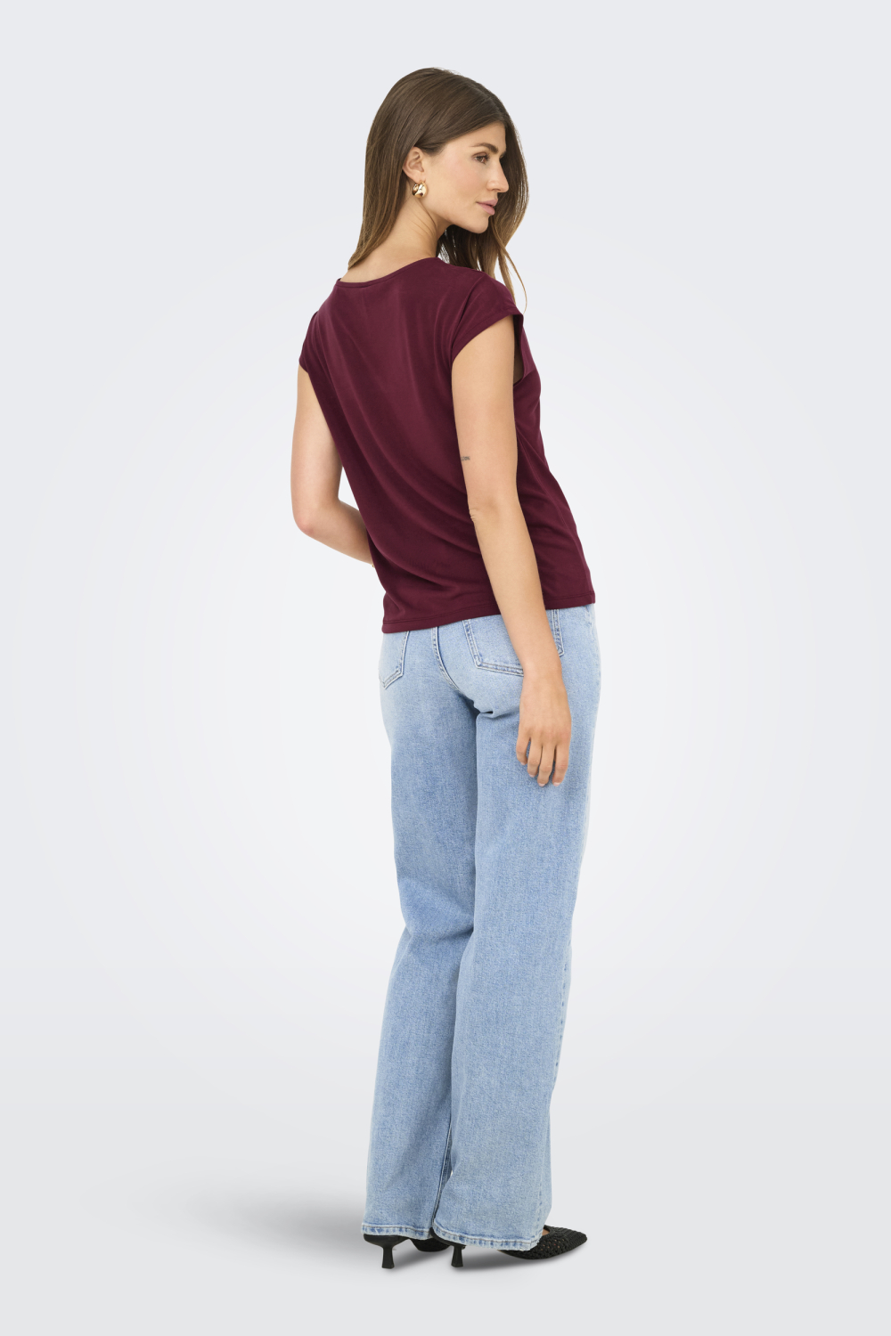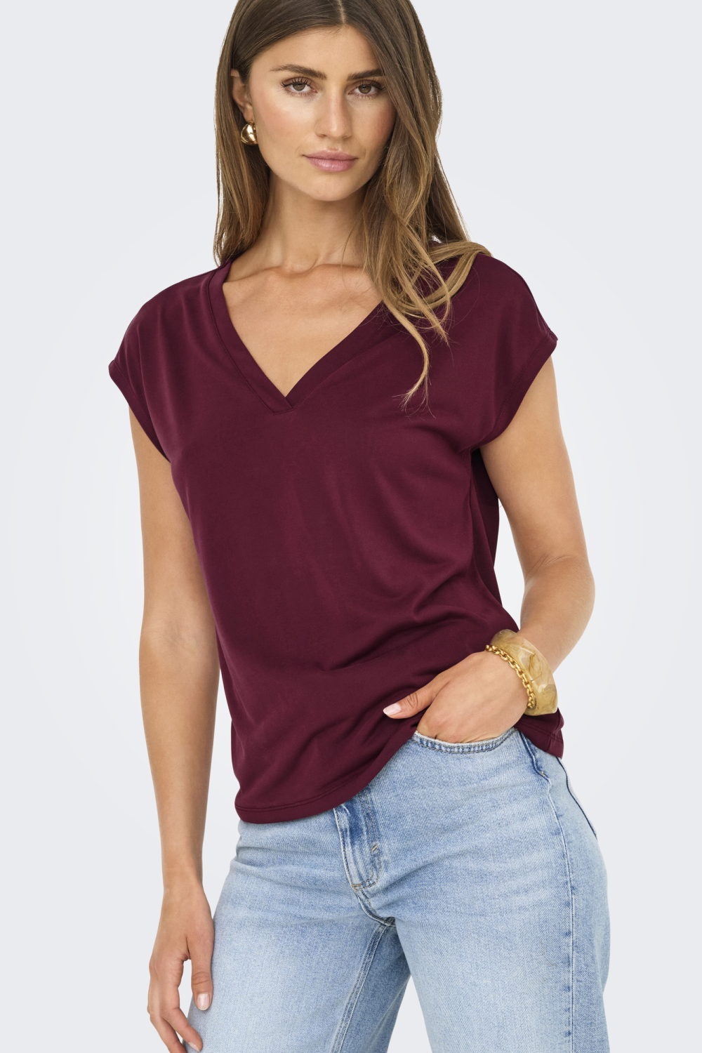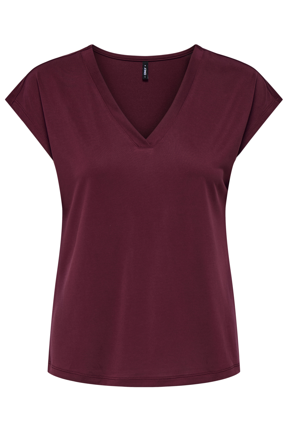 Dit vrouwelijke Tawny Port T-shirt van Only is een prachtige aanvulling op je casual garderobe. Met een verfijnde V-hals en korte kapmouwen biedt het een stijlvolle uitstraling die zowel comfortabel als veelzijdig is. Gemaakt van een duurzame mix van 70% Modal Tencel en 30% polyester, voelt het T-shirt zacht aan op de huid en blijft de stof mooi in vorm. De diepe wijnrode kleur zorgt voor een elegante touch, die moeiteloos past bij zowel een chique als een ontspannen outfit.