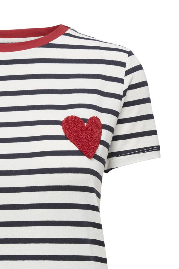 Dit casual T-shirt van Only is een speelse aanvulling op je voorjaarsgarderobe. Het in het oog springende streeppatroon in de kleurcombinatie Cloud Dancer/Night Sky geeft het shirt een frisse uitstraling. De ronde hals en de korte mouwen zorgen voor een comfortabele pasvorm, perfect voor dagelijkse bezigheden. Gemaakt van een zachte mix van 95% viscose en 5% elastan, biedt het T-shirt een lichte stretch voor extra draaggemak. Een bijzonder detail is het rode hart op de borst, dat een charmante en persoonlijke touch geeft aan deze klassieker. Dit shirt is veelzijdig te combineren. Draag het met een jeans voor een casual dagje uit, of met een rok voor een meer vrouwelijke look. Dankzij de normale lengte en de regular fit past het bij verschillende stijlen en gelegenheden. Of je nu aan het shoppen gaat of relaxt in het park, dit T-shirt van Only is een comfortabele keuze voor elke dag.