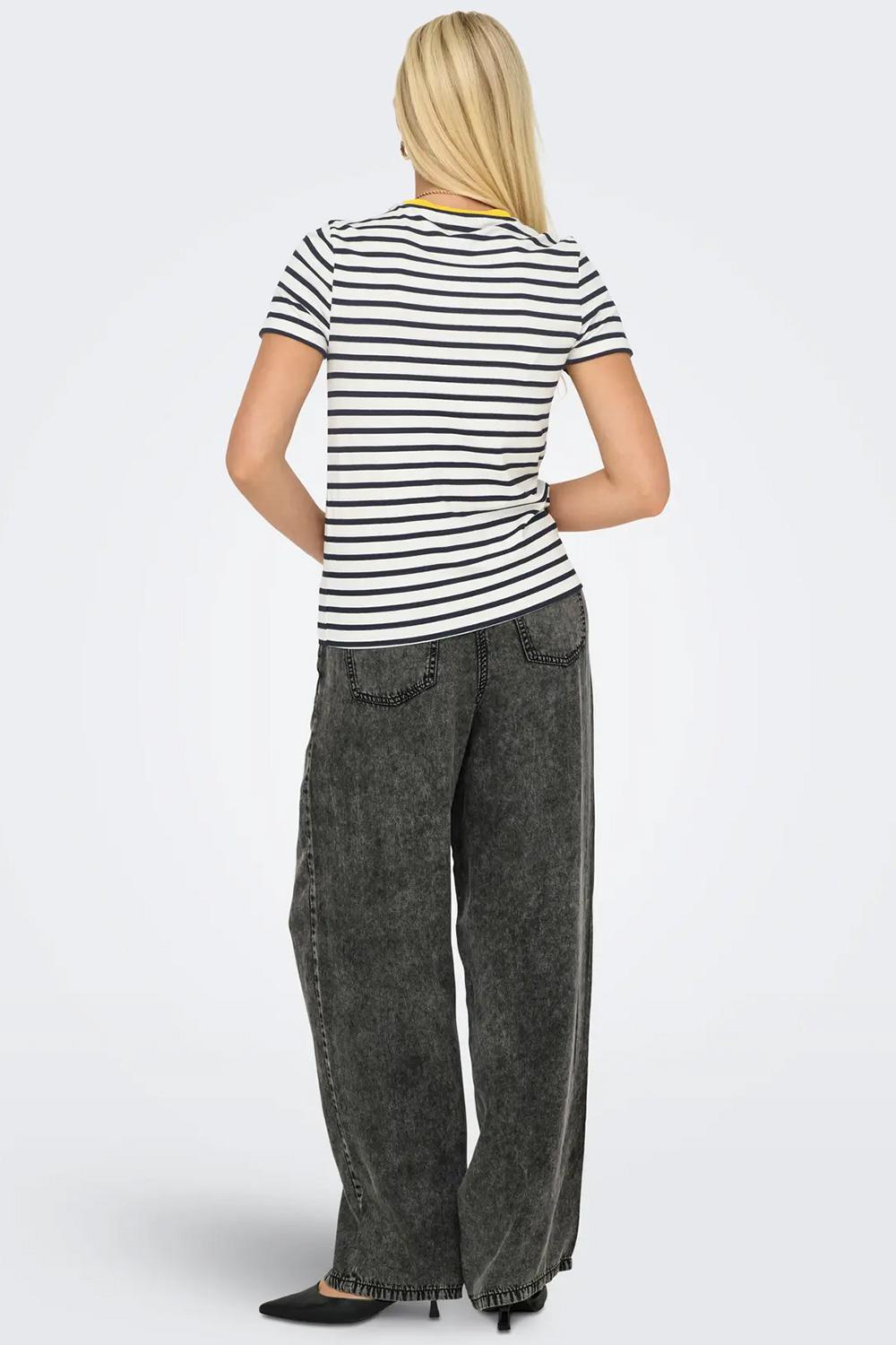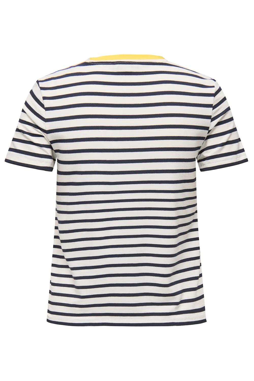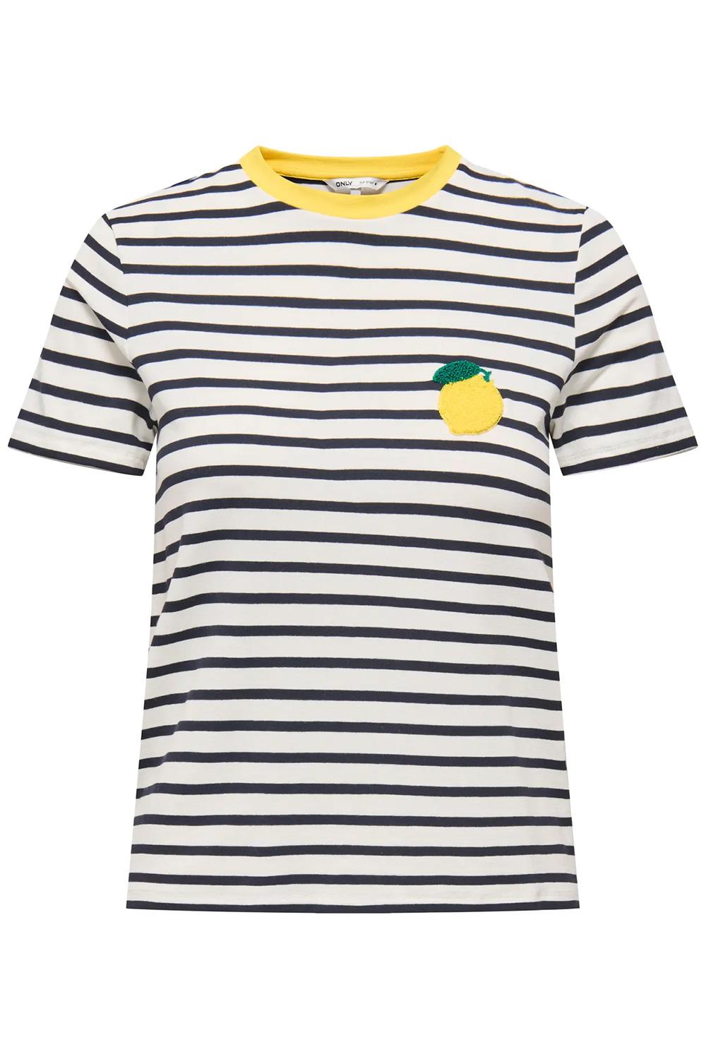 Dit casual gestreepte T-shirt voor dames van Only is een verfijnde keuze voor je alledaagse garderobe. Met een regular fit pasvorm en een comfortabele mix van 95% Viscose Lenzing Ecovero en 5% Elastan, biedt dit shirt je de hele dag door een aangenaam gevoel. De ronde hals is afgewerkt met een opvallend gele bies, wat een speels contrast biedt tegen de strepen in de kleuren Cloud Dancer en Night Sky. Op de borst prijkt een frisse, gele citroenapplicatie die het geheel een vrolijke twist geeft. Of je nu gaat voor een relaxte dag in het park of een gezellige brunch met vrienden, dit T-shirt past perfect bij meerdere gelegenheden. De korte mouwen en normale lengte maken het ideaal voor een casual look, terwijl de strepen en citroenapplicatie het net dat beetje extra geven. Combineer het eenvoudig met een spijkerbroek of een luchtige rok en je bent klaar om te gaan. Met het duurzame materiaal is dit shirt niet alleen stijlvol, maar ook een bewuste keuze voor jouw garderobe.