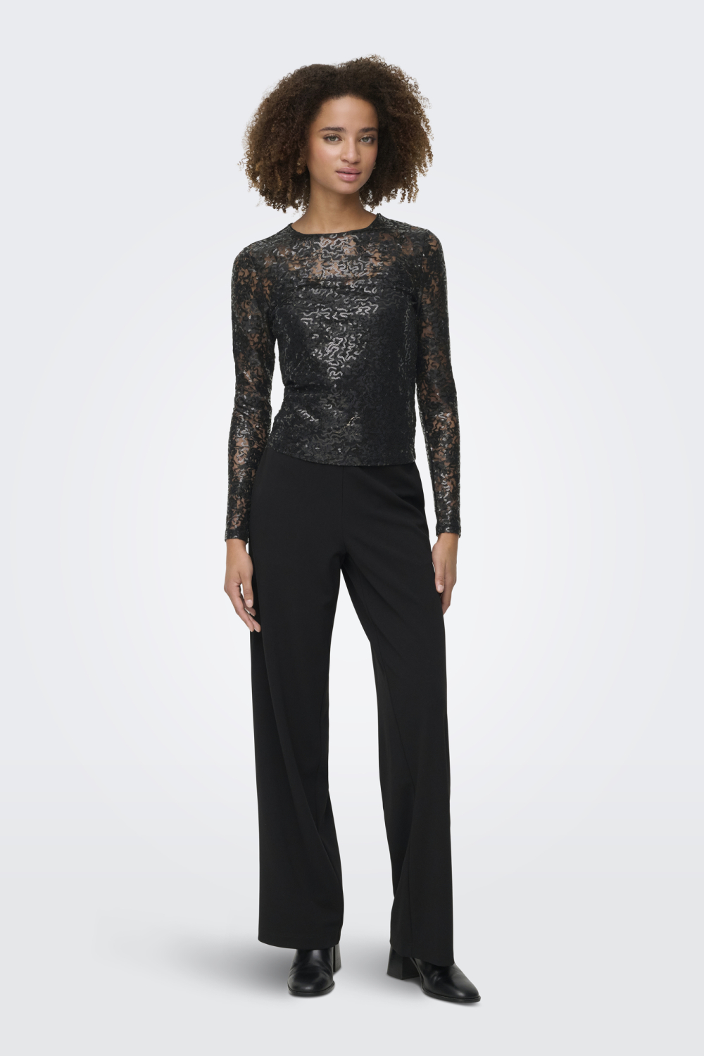 Deze zwarte pailletten top van Only is een opvallende keuze voor de winterse dagen. Met zijn regular fit pasvorm en ronde hals biedt hij een comfortabel gevoel zonder in te leveren op stijl. De lange mouwen en paillettenpatroon geven deze top een feestelijke uitstraling, perfect voor een avondje uit of een gezellig diner. De combinatie van 95% polyamide en 5% elastan zorgt voor een lichte stretch, zodat jij je vrij kunt bewegen. De top is ontworpen met een subtiele knoopsluiting aan de achterkant, wat een verfijnde touch toevoegt. Dankzij de normale lengte past hij gemakkelijk in je garderobe, of je hem nu draagt met een nette broek of een casual jeans. Met deze Only top ben je altijd klaar om stralend voor de dag te komen, of het nu gaat om een speciale gelegenheid of gewoon een stijlvolle winterse outfit.