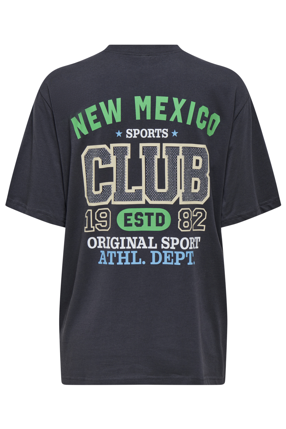 Op de achterkant vind je een grotere grafische print met de tekst "NEW MEXICO SPORTS CLUB", wat het T-shirt een unieke retro-look geeft. De donkergrijze kleur en het contrasterende patroon maken het gemakkelijk te combineren met een jeans of shorts. Dit T-shirt is perfect voor een casual herfstoutfit en zorgt voor een moeiteloze, maar toch trendy uitstraling. Of je nu een dag op pad gaat of gewoon thuis ontspant, dit Only T-shirt biedt veelzijdigheid en stijl.