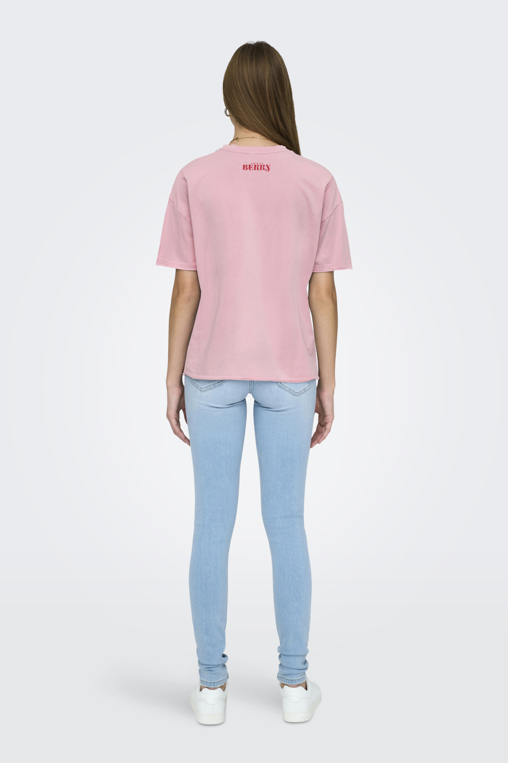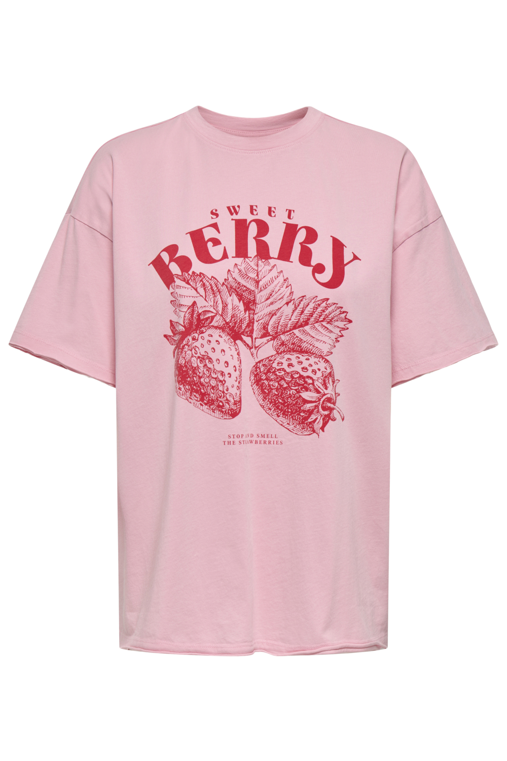 Dit casual T-shirt van Only, uitgevoerd in een zachte roze tint, is een veelzijdige toevoeging aan je lente-garderobe. De opdruk met rode aardbeien en de tekst "Sweet Berry" geeft het shirt een speelse en unieke uitstraling. Gemaakt van 100% biologisch katoen, biedt het comfort en duurzaamheid. Het heeft een regular fit en een ronde hals, wat bijdraagt aan een comfortabele pasvorm die bij diverse lichaamsvormen past. Met korte mouwen en een normale lengte is het ideaal voor warmere dagen.