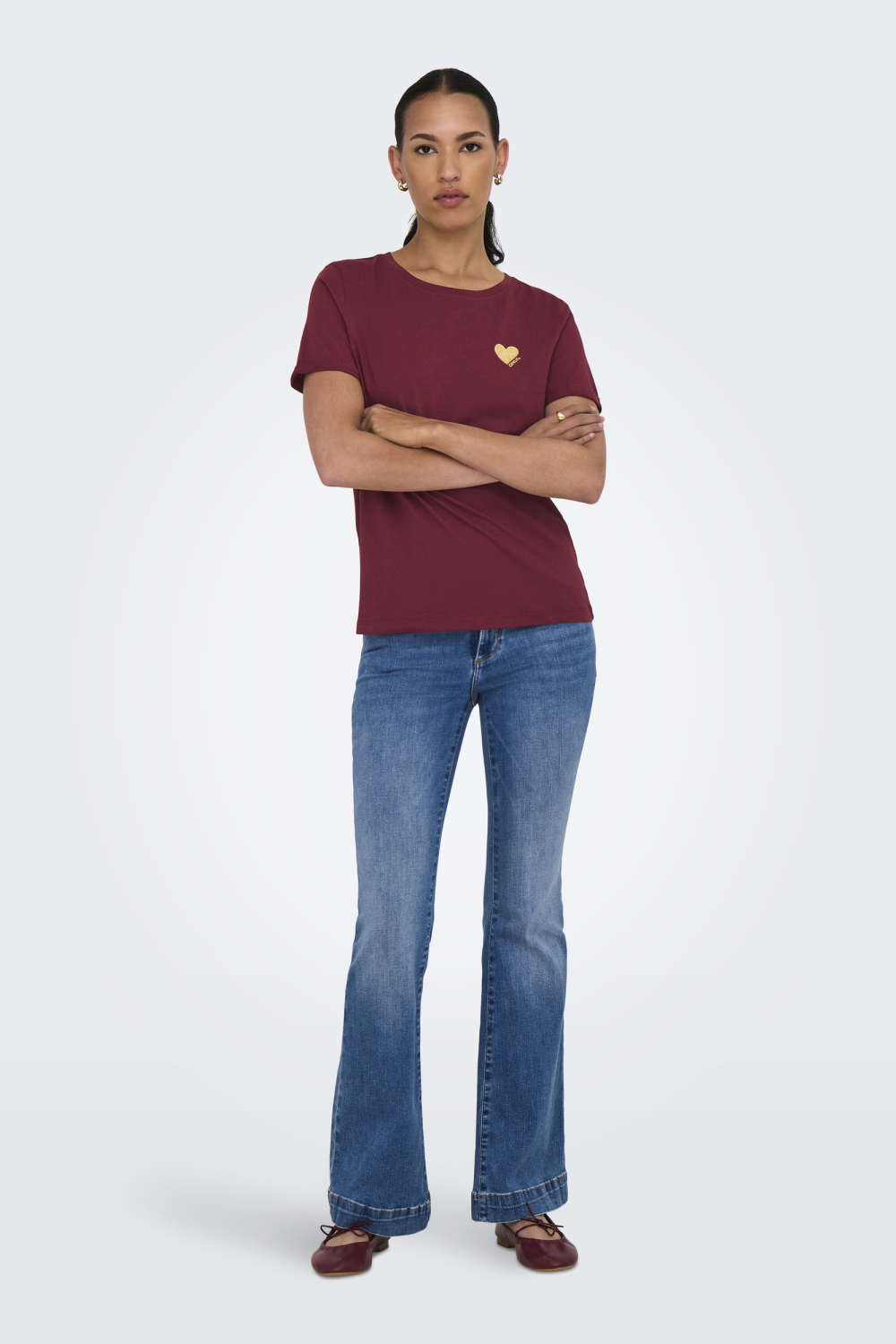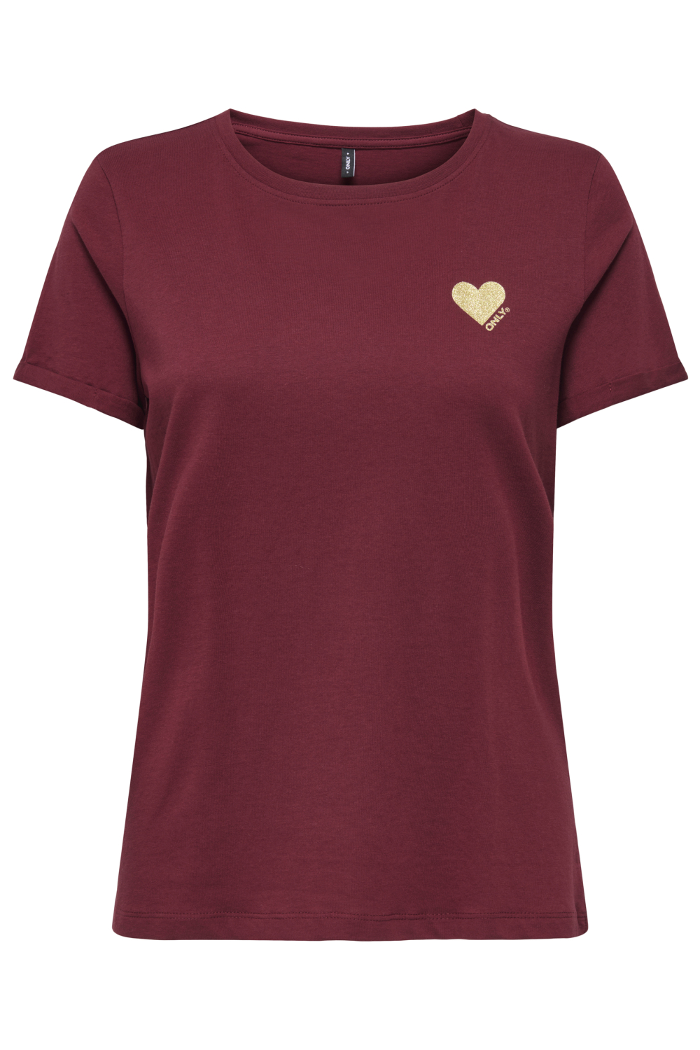 Het Only T-shirt uit de damescollectie straalt elegantie en eenvoud uit. Gemaakt van duurzaam 100% katoen, biedt het een zachte en comfortabele pasvorm. Het diepe cabernet-rood met subtiel goudkleurig glitterdetail in de vorm van een hartje op de borst maakt dit T-shirt uniek en stijlvol. De ronde hals en korte mouw geven het een tijdloze uitstraling, waardoor het perfect is voor casual gelegenheden.
