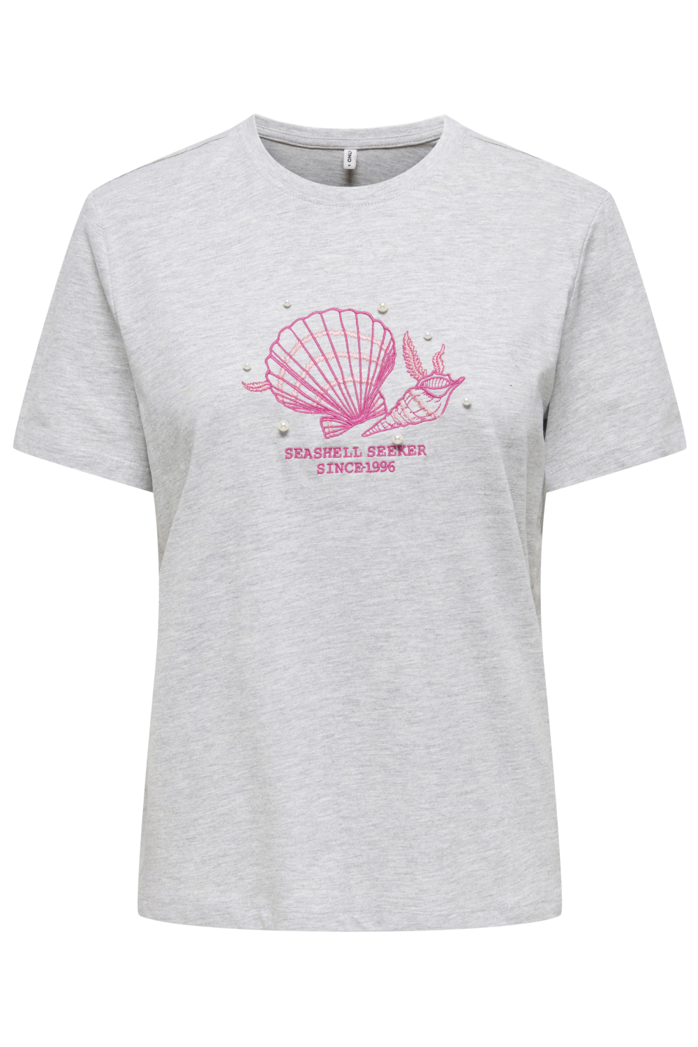 Dit lichtgrijze T-shirt van Only is een casual must-have voor je herfstgarderobe. Met een opvallend roze schelpenontwerp op de voorzijde, versierd met subtiele parels, voegt het een speels detail toe aan je look. De regular fit en de ronde hals zorgen voor een comfortabele pasvorm, terwijl de korte mouwen het geschikt maken voor het mildere herfstweer. Gemaakt van 100% katoen, biedt dit T-shirt zowel stijl als genietbare zachtheid voor dagelijks gebruik.
