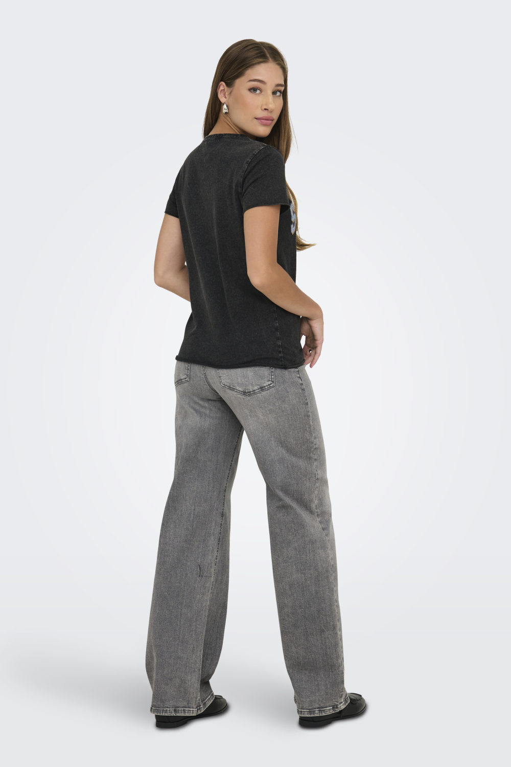 Het T-shirt valt op door zijn subtiele details in de print en de effen zwarte basis, wat het makkelijk maakt om te combineren met verschillende stijlen. Draag het met een stoere jeans voor een nonchalante look, of voeg een leren jasje toe voor wat extra flair. De normale lengte maakt het ook geschikt om in of over een broek te dragen, afhankelijk van je persoonlijke stijl. Of je nu een dagje gaat winkelen of een festival bezoekt, dit Only T-shirt is een veelzijdige en stijlvolle keuze.