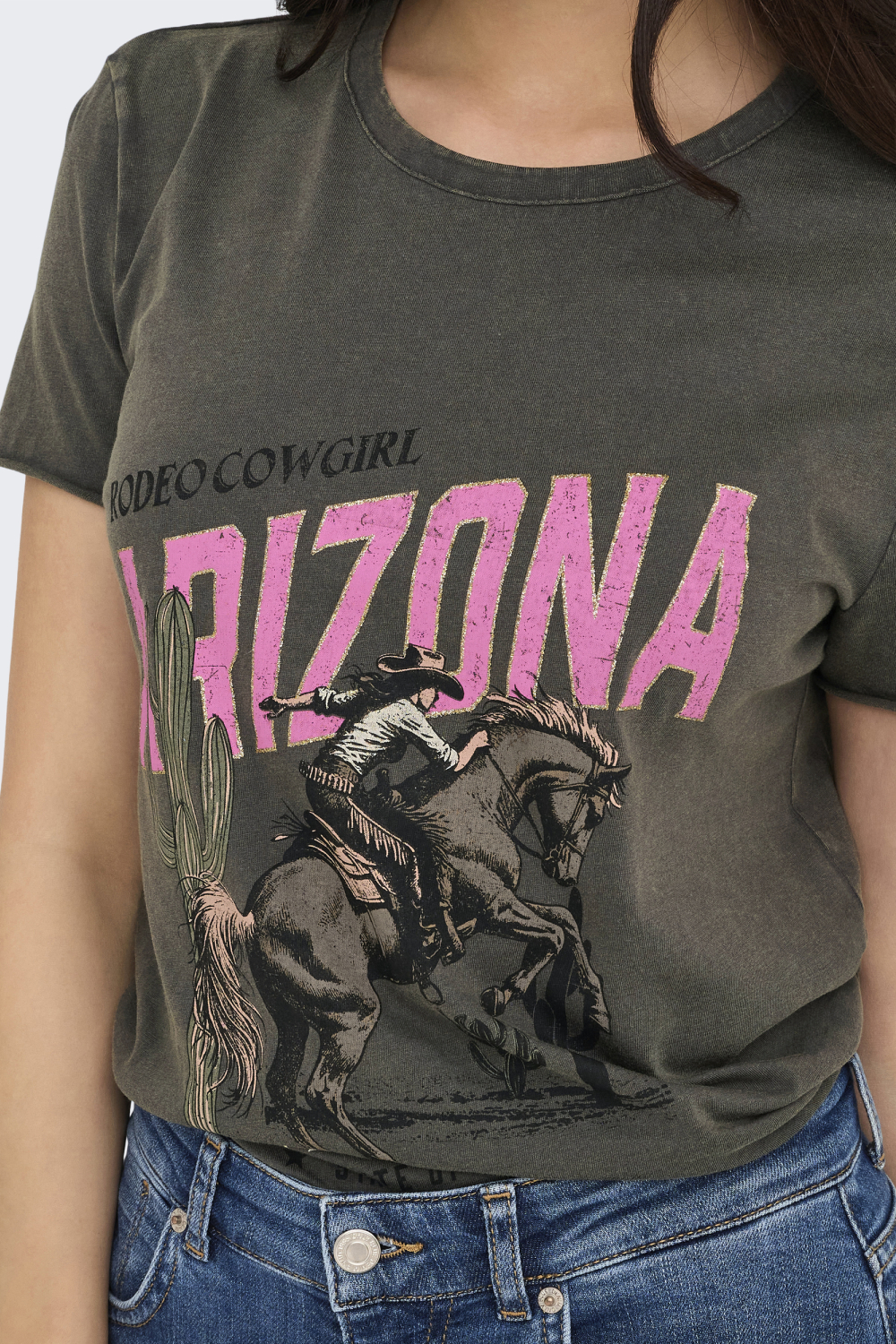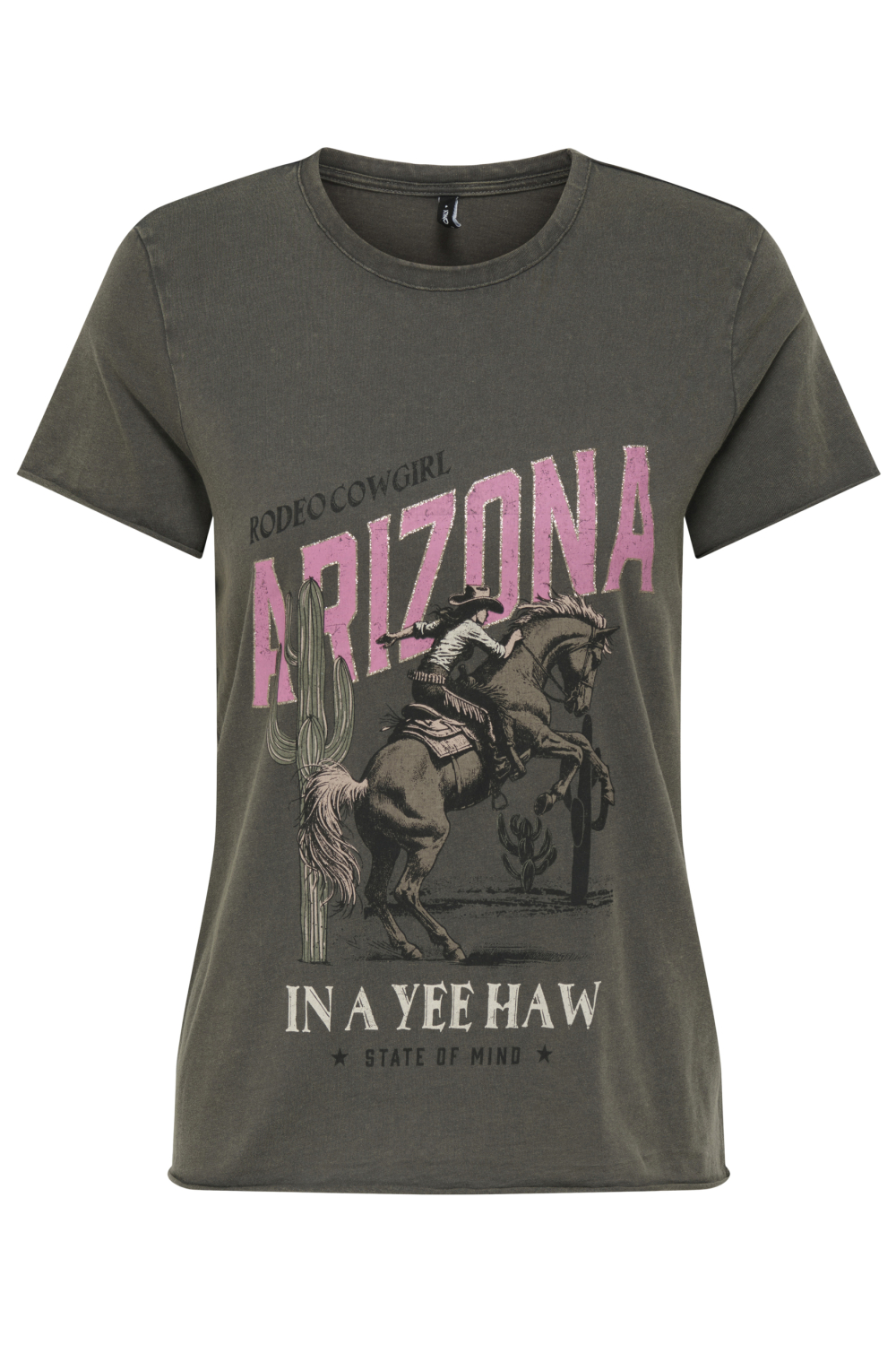 Dit stoere dames T-shirt van Only combineert een casual uitstraling met een opvallend ontwerp. Gemaakt van 100% organisch katoen, biedt het een duurzame en comfortabele ervaring. De regular fit met een ronde hals en korte mouwen zorgt voor een ontspannen pasvorm die bijdraagt aan jouw alledaagse look. Het T-shirt heeft een antracietkleurige basiskleur met een gave "Arizona" cowboy print in felroze en aardetinten, waardoor het perfect is om een persoonlijke touch aan je outfit toe te voegen.