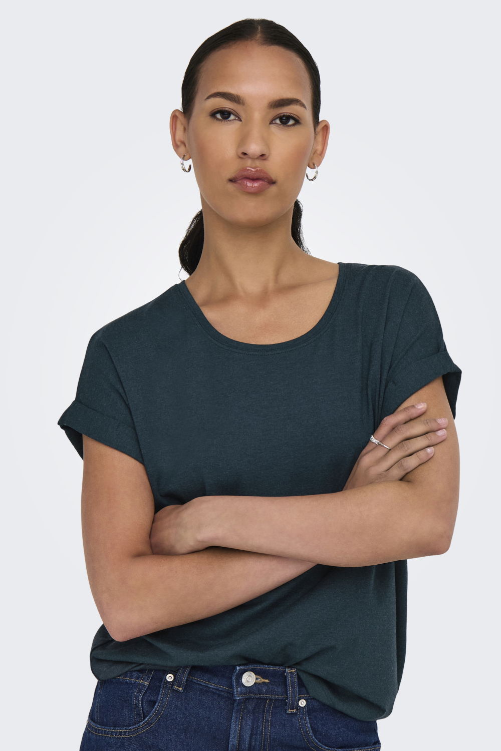 De subtiele, diepe kleur maakt het een goede keuze voor zowel binnen als buiten. Of je nu een dagje door de stad slentert, luncht met vrienden of een rustige dag thuis plant, dit T-shirt biedt je de flexibiliteit en stijl die je zoekt. De omgeslagen mouwen geven het geheel een speelse touch, terwijl de normale lengte zorgt voor een prettige pasvorm. Dit T-shirt is een basisstuk dat je keer op keer uit de kast zult halen.