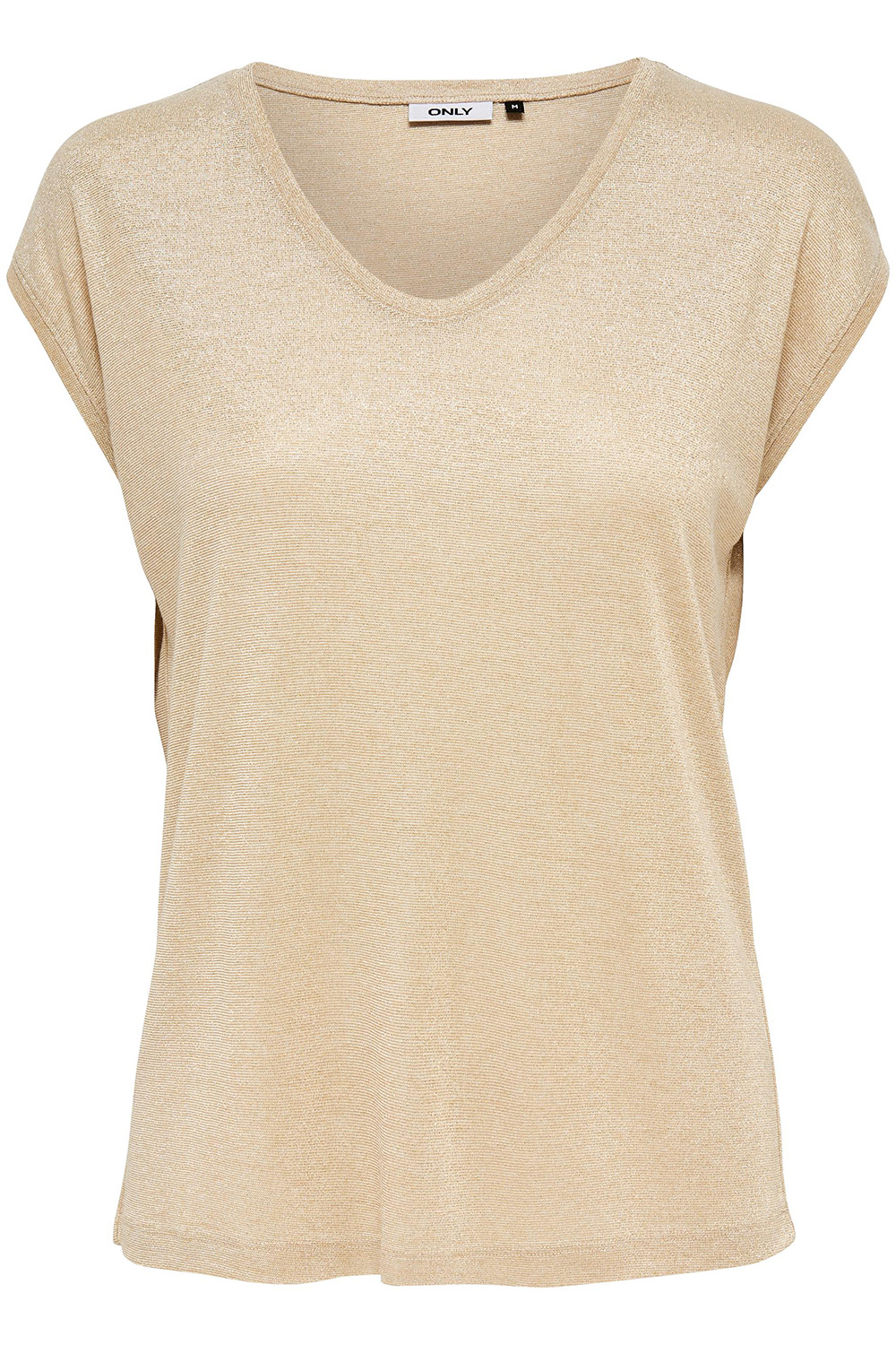 Dit elegante dames T-shirt van Only is een veelzijdige must-have voor jouw dagelijkse garderobe. Gemaakt van een zachte mix van polyester, viscose en metaalgaren, biedt het een comfortabele pasvorm en een subtiel glinsterende look dankzij de gouden kleur en glitters. De regular fit en de kapmouw zorgen voor een casual en toch stijlvolle uitstraling, perfect voor zowel ontspannen als iets formelere aangelegenheden. De V-hals van het T-shirt voegt een verfijnde touch toe, terwijl de normale lengte ervoor zorgt dat het goed valt op verschillende lichaamsvormen. Dit T-shirt is de ideale keuze voor basisoutfits met een chic randje. Combineer het met een jeans voor een trendy, alledaagse look of draag het met een rok voor een verfijndere gelegenheid. Of je nu op kantoor bent of gezellig met vrienden uitgaat, dit glinsterende T-shirt geeft je outfit altijd net dat beetje extra flair.