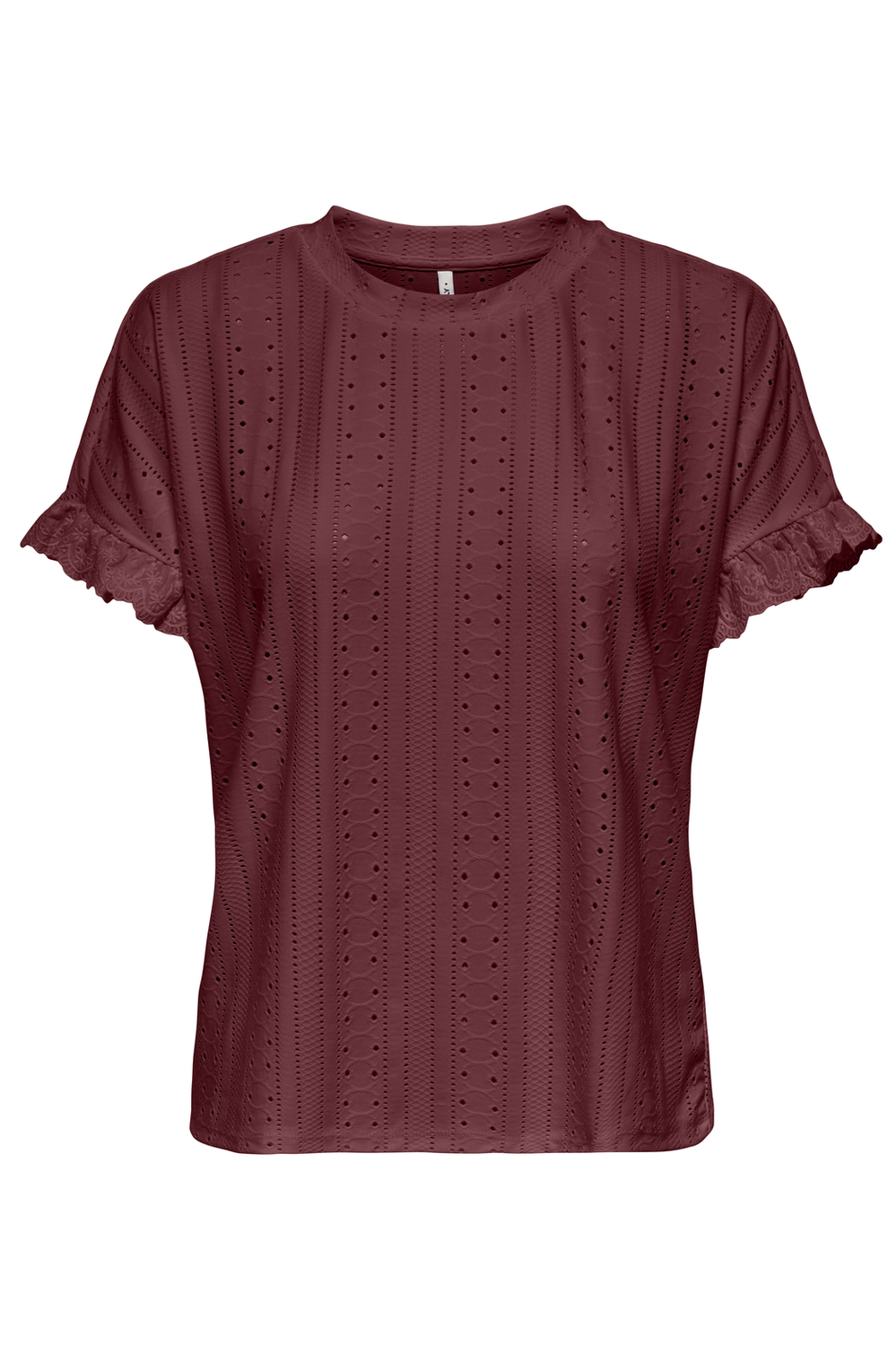 Dit casual T-shirt van Only in de kleur RUBY WINE is een stijlvolle keuze die niet mag ontbreken in je zomergarderobe. Het T-shirt is ontworpen met een opvallend ajourpatroon dat net dat beetje extra flair geeft aan je dagelijkse look. Gemaakt van 95% polyester en 5% elastan, biedt het een comfortabele pasvorm met een lichte stretch voor extra bewegingsvrijheid. De ronde hals en korte mouwen met subtiele ruches voegen een speelse touch toe, ideaal voor een ontspannen dagje uit of een casual afspraak.
