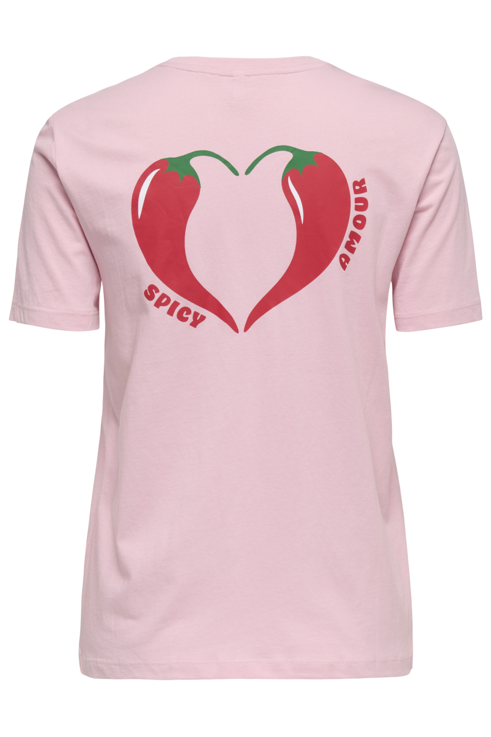 Dit casual dames T-shirt van Only voegt een speelse twist toe aan je garderobe. Het lichtroze shirt, gemaakt van 100% biologisch katoen, biedt zowel comfort als duurzaamheid. De ronde halslijn en de korte mouwen maken dit T-shirt ideaal voor de lente. De voorzijde is subtiel voorzien van een klein hartdetail, terwijl de achterzijde een opvallende graphic heeft met 'Spicy Amour' in levendige kleuren, wat een unieke flair aan je look toevoegt. Met een regular fit valt het T-shirt comfortabel en geeft het een ontspannen uitstraling. Perfect voor een informele dag uit, gecombineerd met een spijkerbroek of shorts, of draag het gelaagd onder een jas voor een extra dimensie aan je outfit. Of je nu een dag doorbrengt in de stad of ontspant in het park, dit T-shirt biedt veelzijdigheid zonder in te boeten op stijl.