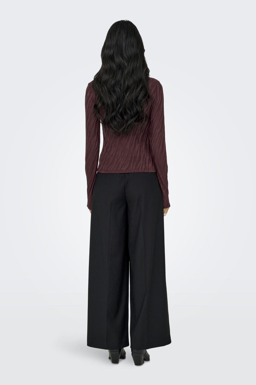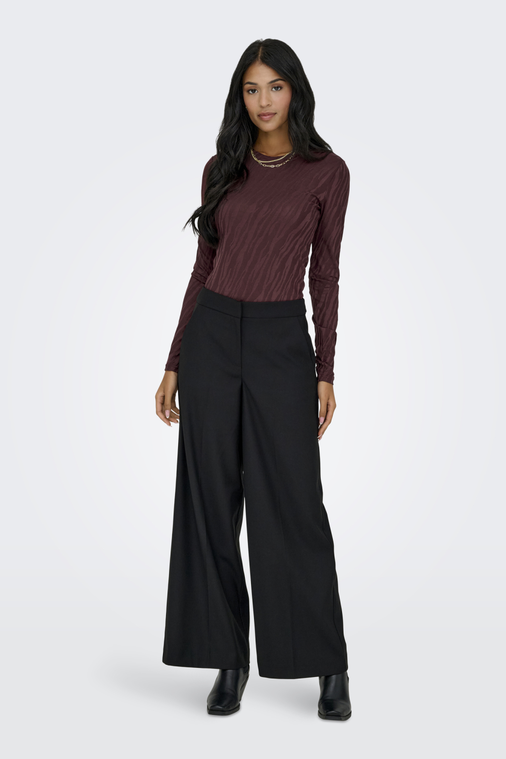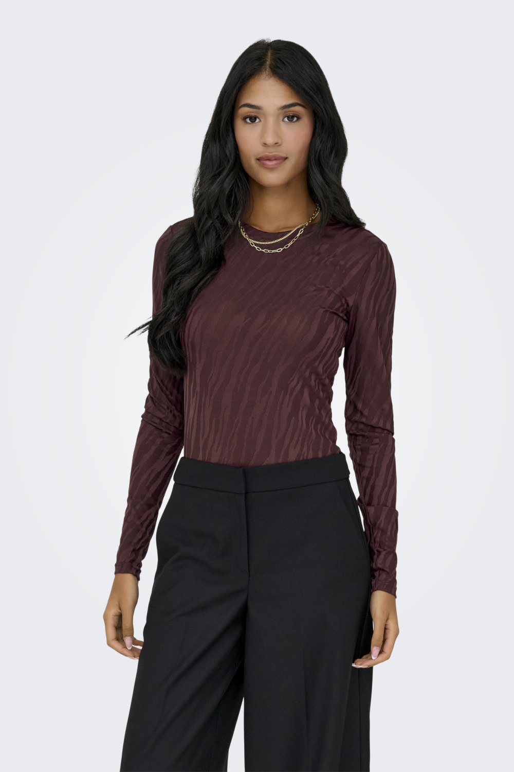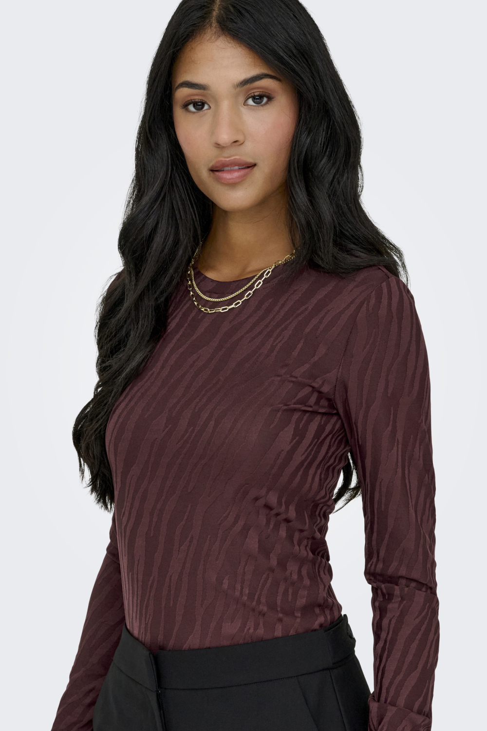 Dit Only T-shirt voor dames is een stijlvolle en veelzijdige toevoeging aan je wintergarderobe. Het shirt heeft een rijke bordeauxrode kleur met een subtiele structuur, wat zorgt voor een unieke en modieuze uitstraling. De ronde hals en lange mouwen maken het geschikt voor koude dagen, terwijl het comfort van de regular fit je alle bewegingsvrijheid biedt die je nodig hebt. Gemaakt van een mix van 95% polyester en 5% elastaan, voelt het materiaal zacht aan op de huid en biedt het een lichte stretch voor een perfecte pasvorm.