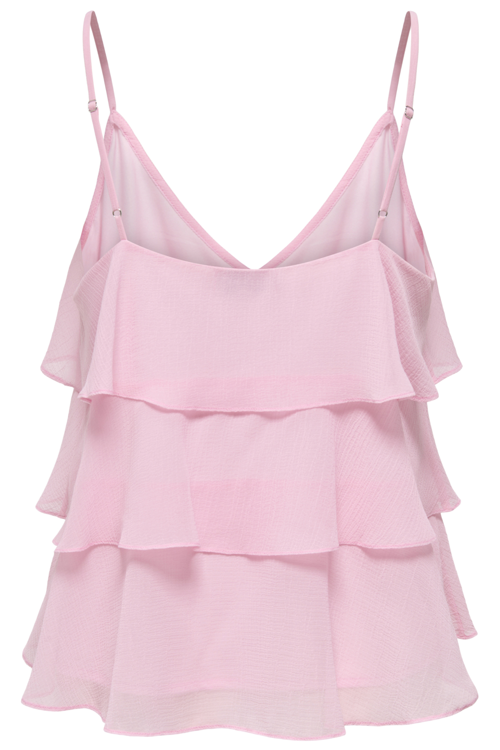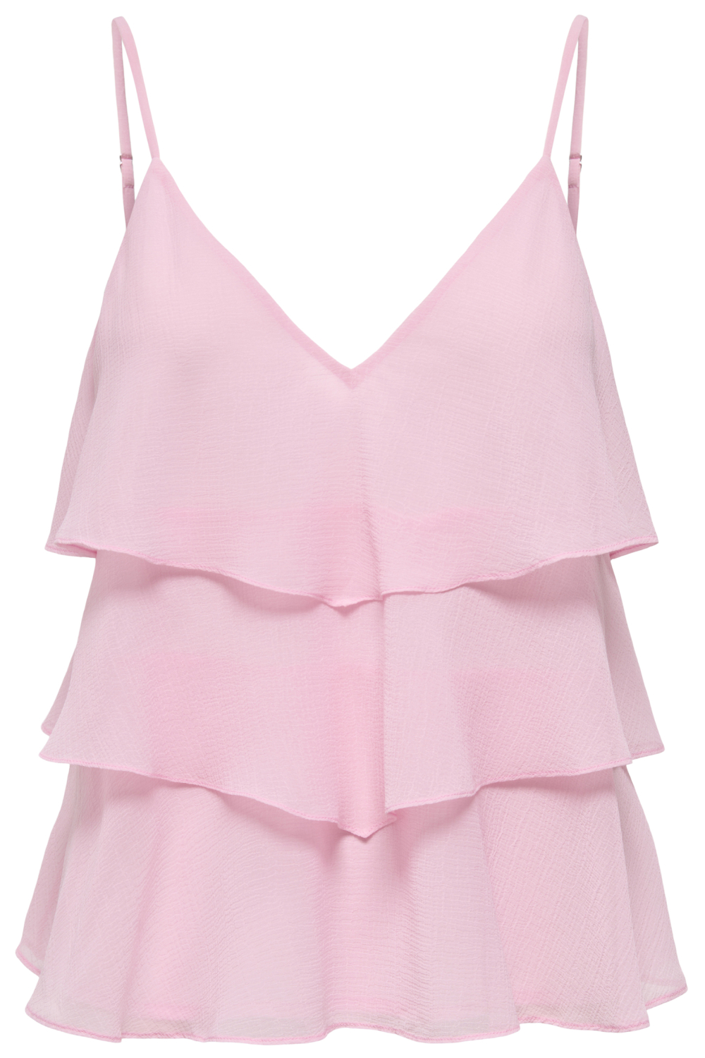 Deze Only top is een verfijnde aanvulling voor je casual garderobe. Vervaardigd uit 100% gerecycled polyester, combineert het duurzaamheid met stijl. De frisse roze kleur en ruches geven de top een speelse uitstraling. Met de V-hals en verstelbare spaghettibandjes zit de top altijd comfortabel en sluit het perfect aan op jouw stijl. De normale lengte en regular fit maken deze top veelzijdig in gebruik, ideaal voor zowel dagelijkse uitstapjes als een zomerse avond uit. De Only top past perfect bij verschillende kledingcombinaties. Voor een luchtige look kun je deze combineren met een lichte jeans of een zwierige rok. Dankzij het elegante ontwerp met ruches en de spaghettibandjes is het ook een uitstekende keuze voor feestelijke gelegenheden. De top behoudt een tijdloze charme en is een goede match voor vrijwel elke gelegenheid, van een ontspannen brunch tot een dagje shoppen. Kies deze stijlvolle en verantwoorde optie om je garderobe mee te verfrissen.