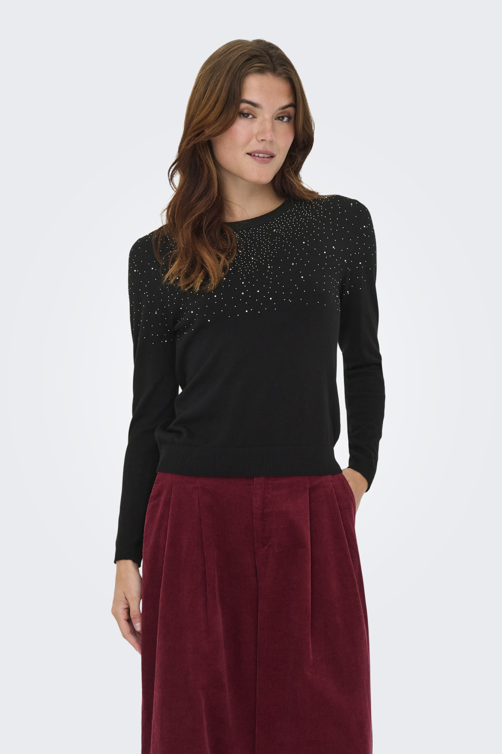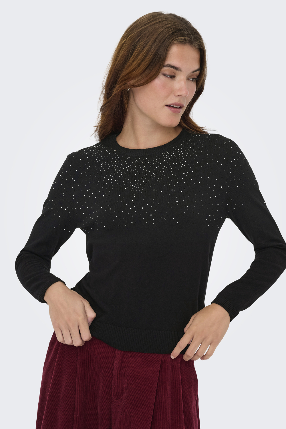 Deze stijlvolle zwarte trui van Only is een perfecte aanvulling op je herfstgarderobe. Het knitwear ontwerp combineert een zachte mix van 80% viscose en 20% nylon, waardoor je zowel comfort als een elegante uitstraling ervaart. Met een regular fit pasvorm en een ronde hals, biedt deze trui een moderne look die makkelijk te combineren is. De opvallende strass details voegen een subtiele glamour toe, ideaal voor zowel een casual dagje uit als een avondje weg.