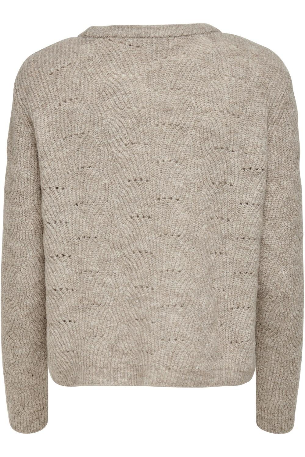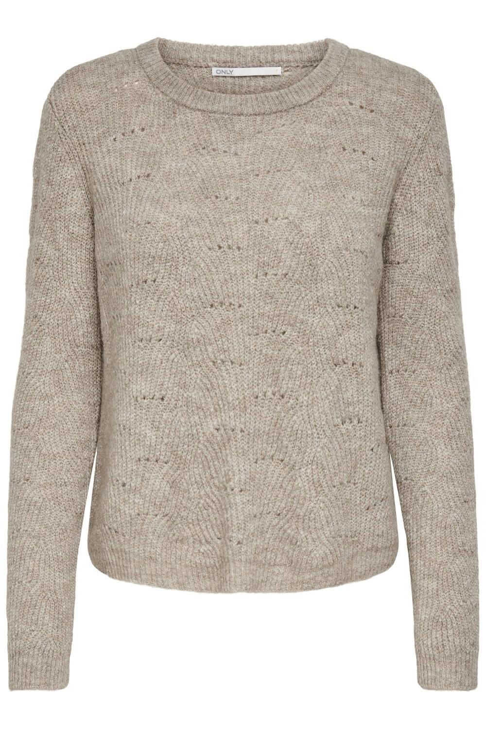 Gebreide trui van Only met een allover ajour patroon. Dit gemeleerde model heeft een ronde hals en lange mouwen. De trui is afgewerkt met een ribgebreide boord.