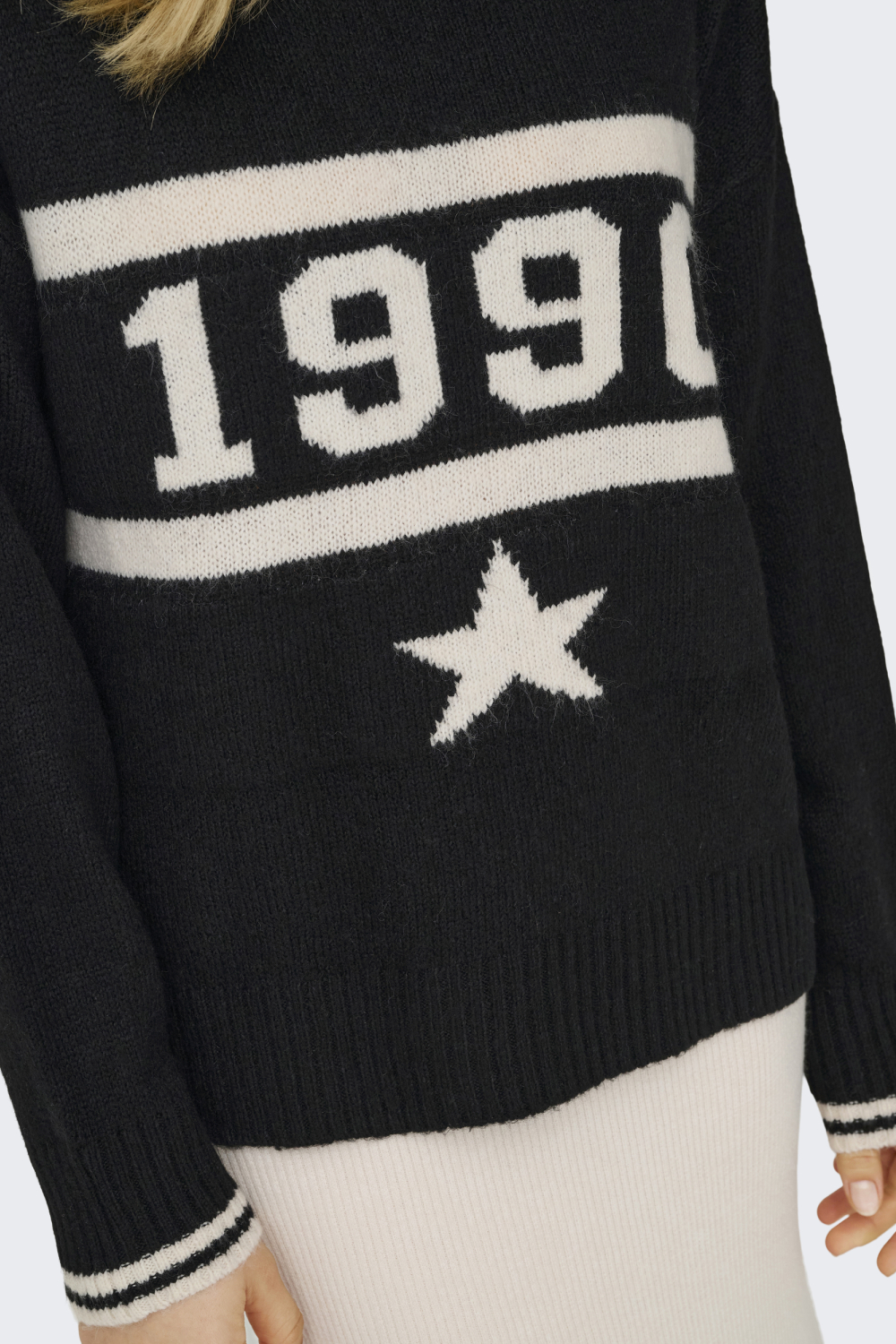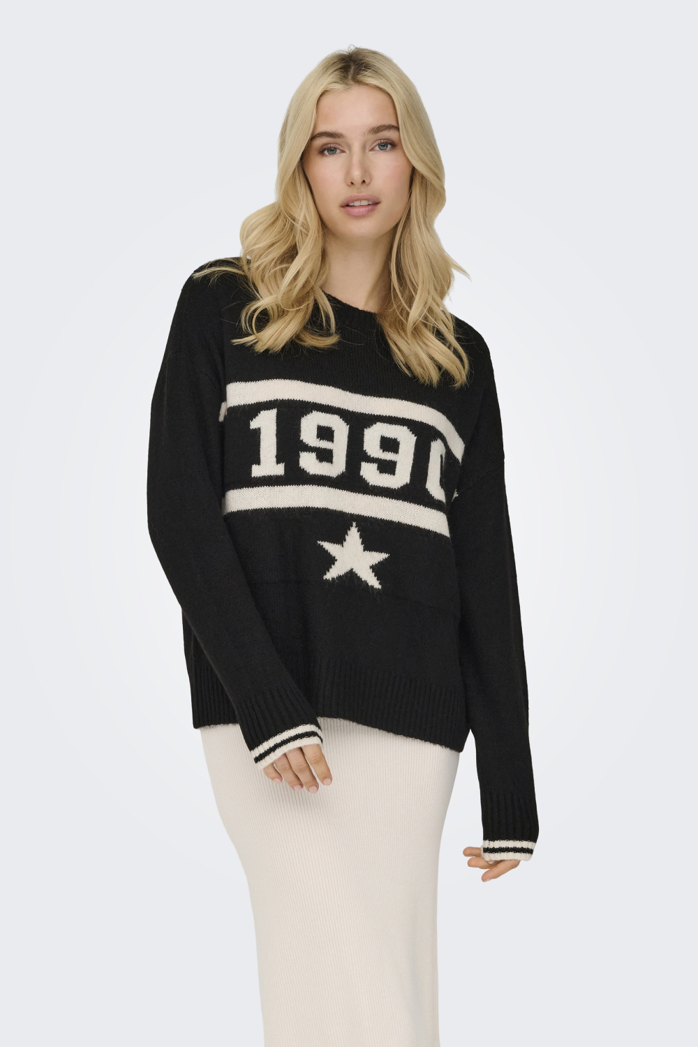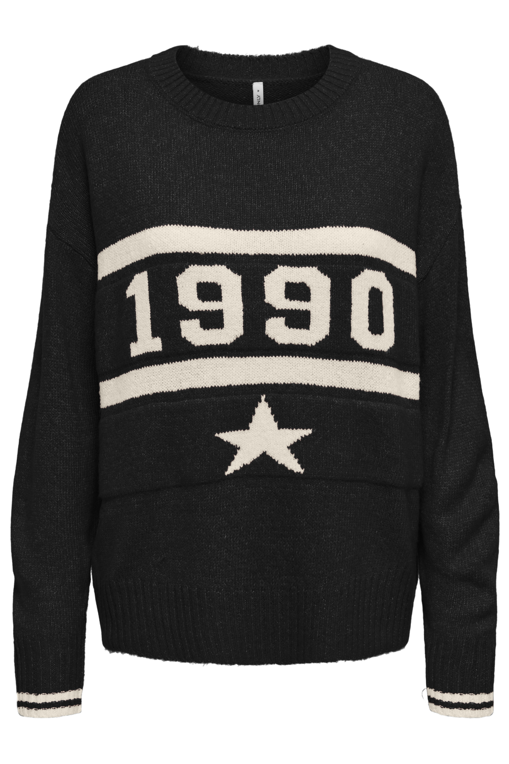 Deze zwarte Only trui voor dames brengt een vintage touch naar je herfstgarderobe. Met de opvallende '1990' tekst en witte ster centraal op de borst, is deze trui niet alleen stijlvol, maar ook een statement op zich. De regular fit en ronde hals bieden je een comfortabele pasvorm, perfect voor de koude dagen die eraan komen. Dankzij de lange mouwen en het duurzame materiaal blijf je warm terwijl je er modieus uitziet. De trui is veelzijdig en makkelijk te combineren. Draag hem casual met je favoriete jeans en sneakers voor een relaxte look, of combineer hem met een rok en laarzen voor een meer geklede outfit. Of je nu een dagje uit plant of gewoon thuis blijft, deze Only trui biedt de perfecte balans tussen stijl en comfort. Het subtiele patroondetail voegt een speelse twist toe, waardoor het een unieke aanvulling is voor elke herfstoutfit.