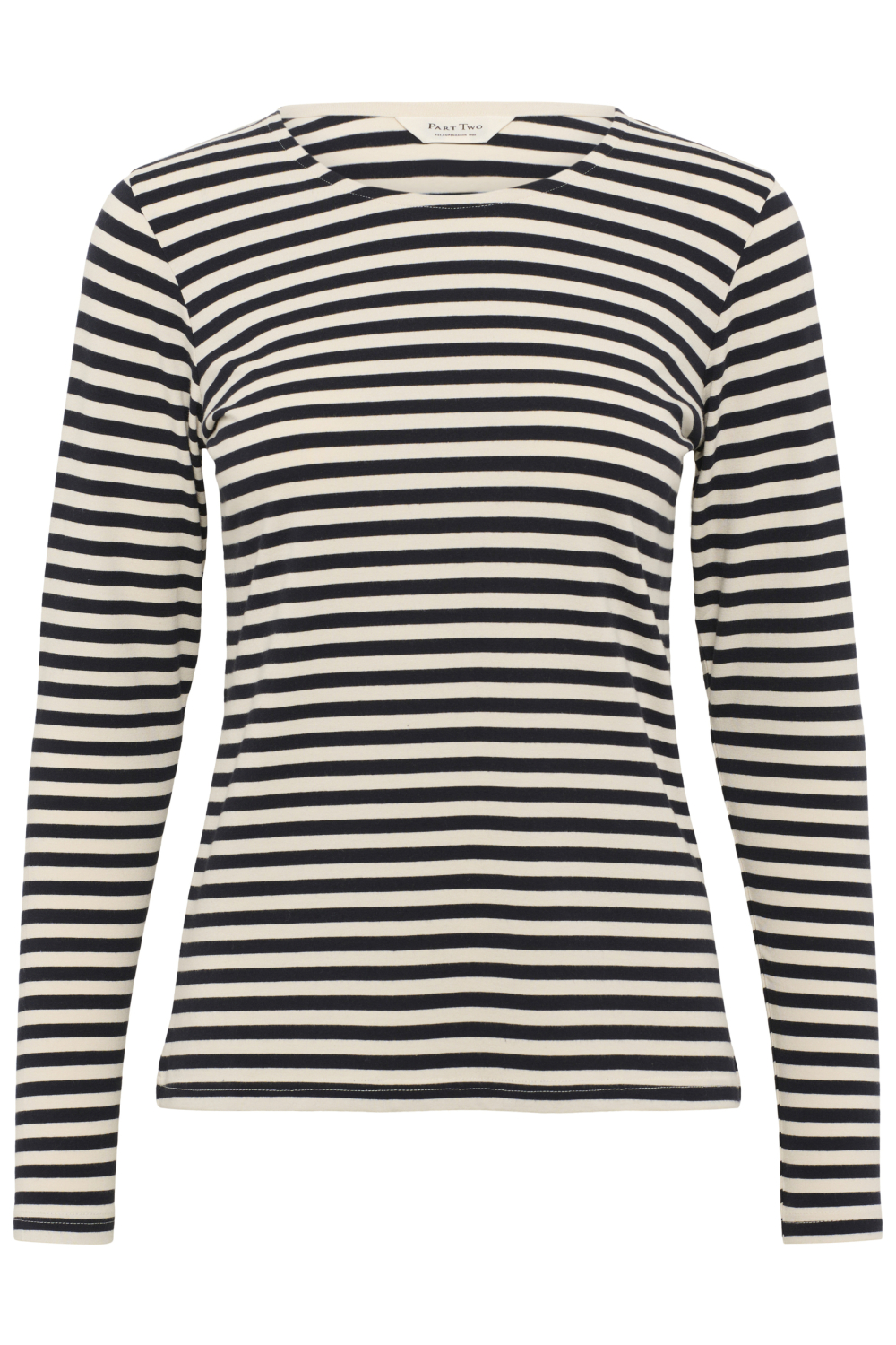 Dit gestreepte dames T-shirt van Part Two is een veelzijdig en stijlvol item voor je herfstgarderobe. Met zijn slimme slim fit pasvorm sluit het mooi aan op je lichaam, terwijl de combinatie van 50% modal, 44% organisch katoen en 6% elastaan zorgt voor een comfortabele stretch. De klassieke zwart-witte strepen geven je outfit een tijdloze uitstraling, wat het een uitstekende keuze maakt voor zowel casual als semi-formele gelegenheden. De ronde halslijn voegt een subtiel, vrouwelijk detail toe aan het ontwerp. Dankzij de lange mouwen biedt dit T-shirt extra warmte voor de koelere dagen, terwijl de normal fit lengte het makkelijk te combineren maakt met zowel een nette pantalon als je favoriete jeans. Of je nu een dag op kantoor doorbrengt of een gezellige middag met vrienden plant, dit Part Two T-shirt past perfect bij elke situatie. Kies voor een duurzame en stijlvolle optie die je garderobe verrijkt en je een goed gevoel geeft.
