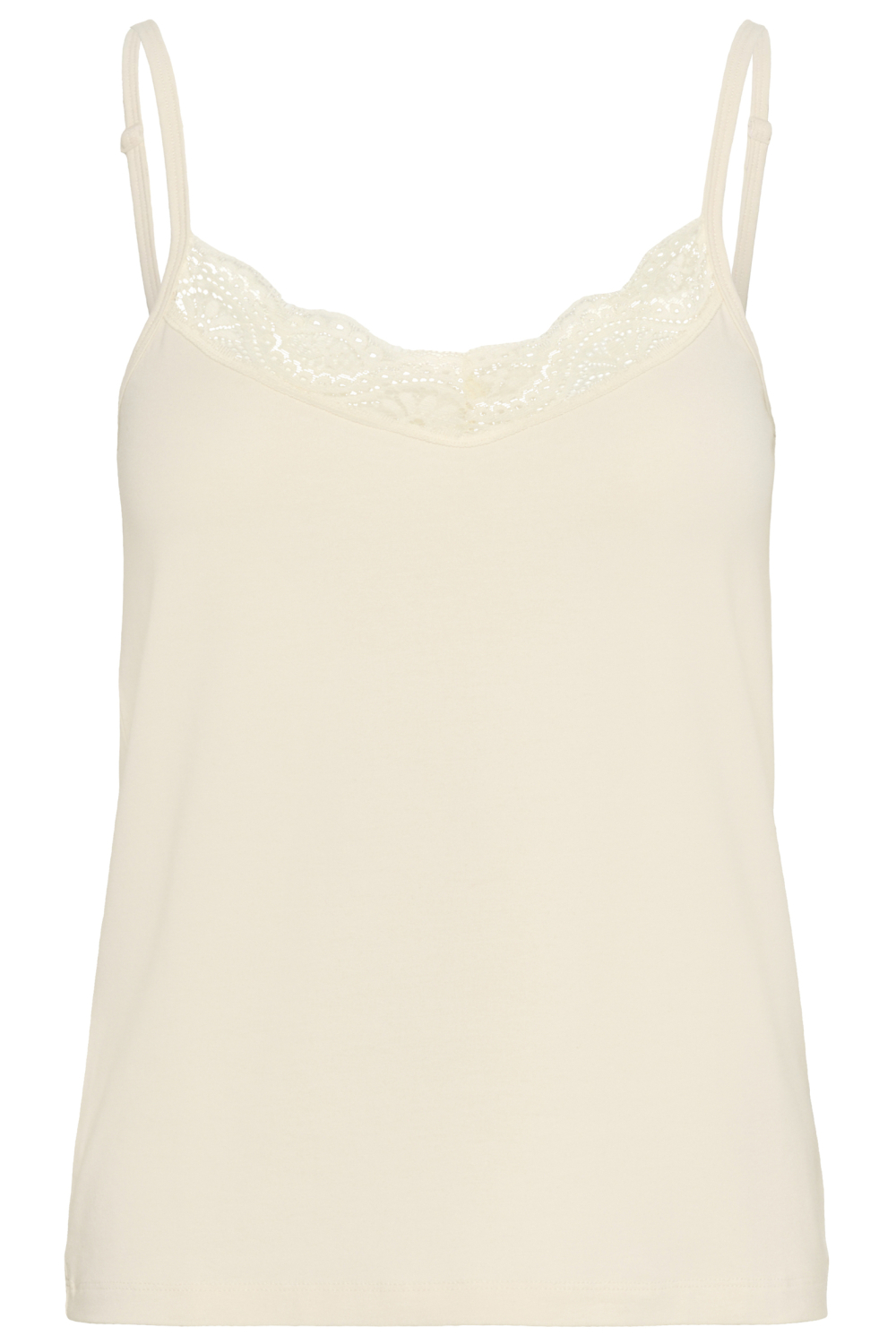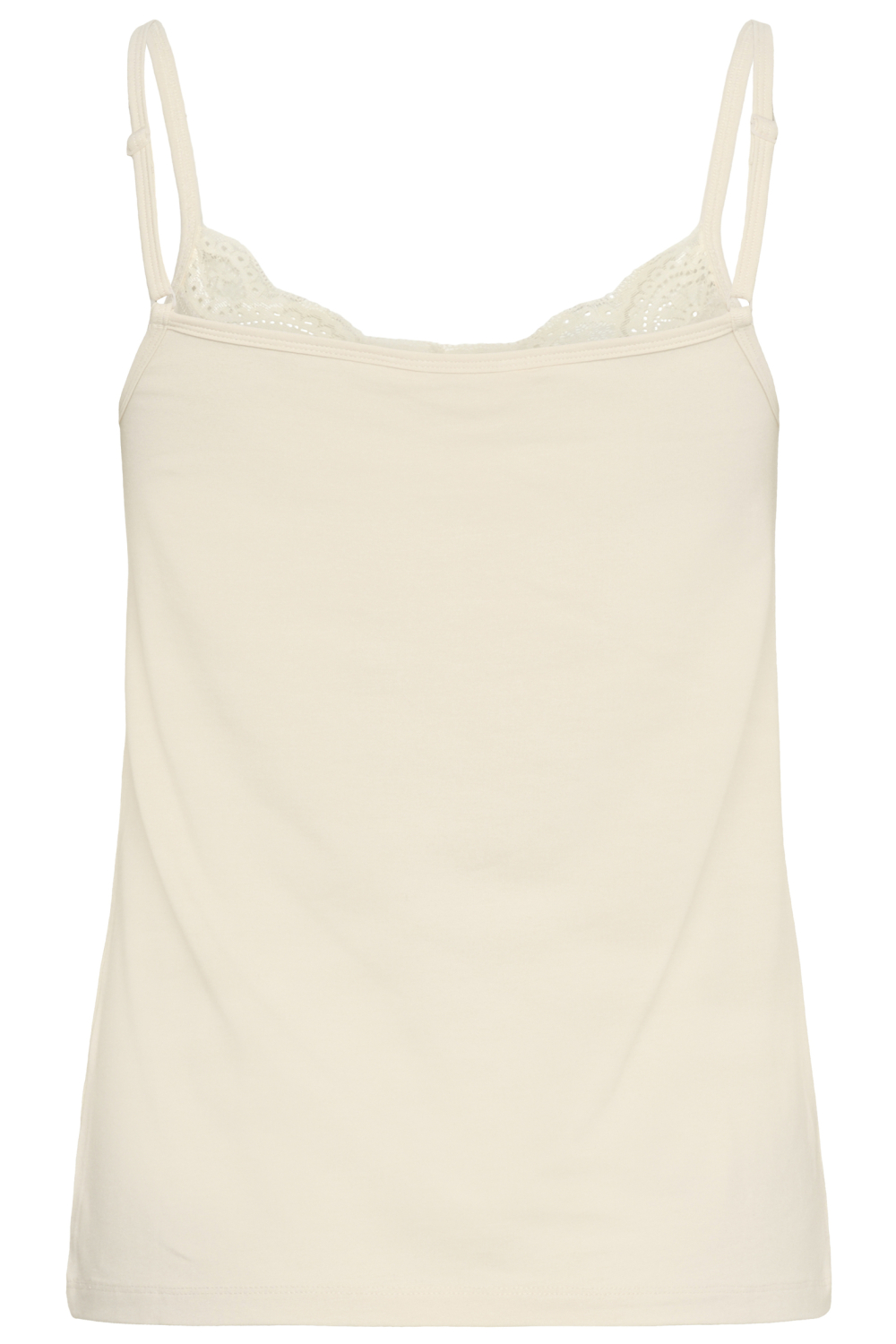 Deze prachtige top van Part Two biedt jou een subtiele combinatie van eenvoud en elegantie. De witte kleur, bekend als WHITECAP GRAY, wordt verrijkt met een verfijnd kanten patroon langs de V-halslijn, waardoor een vrouwelijke touch ontstaat. De top heeft een slim fit pasvorm en is gemaakt van een duurzame mix van 50% modal, 44% organisch katoen en 6% elastan. Dit zorgt voor een zachte stof die zich perfect naar je lichaam vormt, terwijl de spaghettibandjes een luchtige uitstraling geven.