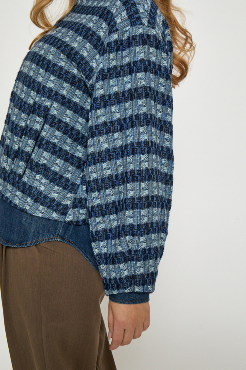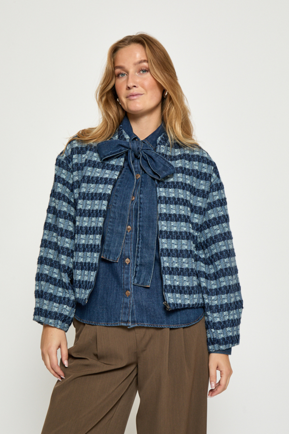 Deze stijlvol gecheckte jas van Peppercorn is de ideale toevoeging voor jouw lente garderobe. Met zijn frisse blauw- en witkleurige patroon en oversized pasvorm biedt deze jas zowel stijl als comfort. De korte lengte en ronde hals maken het gemakkelijk om te combineren met verschillende outfits, terwijl de polyester voering voor een lichte en soepele draagervaring zorgt. De rits aan de voorkant zorgt voor een gemakkelijke sluiting, en de steekzakken bieden een praktische opbergruimte. Een casual stijl die perfect is voor dagelijkse uitstapjes of een ontspannen avondje uit. Dankzij de structuur van de stof krijgt de jas textuur en een eigentijdse uitstraling. Combineer hem met een denim blouse en een comfortabele broek voor een complete look. De jas is een veelzijdig kledingstuk dat zich moeiteloos aanpast aan verschillende kledingstijlen en gelegenheden, van een middagwandeling tot een lunchafspraak. Met deze jas ben je goed voorbereid op de frisse lentedagen. Meer informatie: De totale lengte is 57 cm bij maat 36.