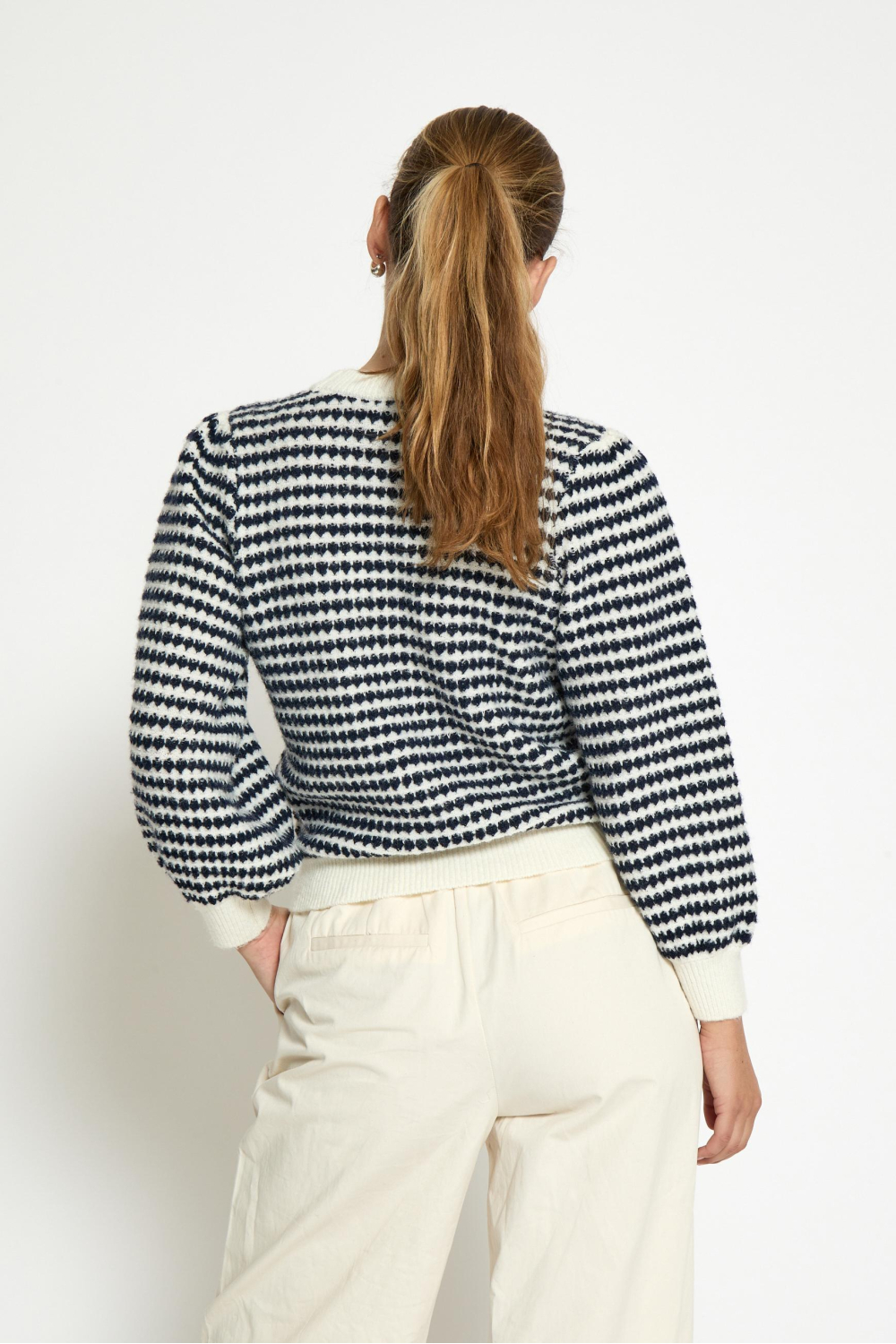 Deze stijlvolle trui van Peppercorn is een elegante toevoeging aan je herfstgarderobe. Met zijn opvallende streeppatroon in navy en wit, trekt deze knitwear zeker de aandacht. De trui heeft een regular fit en is ontworpen met een ronde hals en driekwartmouwen, waardoor hij comfortabel en veelzijdig is. De structuur van de stof geeft een textuur die zowel casual als chic is, ideaal voor verschillende gelegenheden. De Peppercorn trui is perfect voor een stijlvolle look tijdens een ontspannen dag of een informele bijeenkomst. Combineer hem met een lichte broek voor een frisse herfstoutfit of draag hem over een blouse voor extra warmte en een gelaagde look. Zonder voering, voelt de trui licht aan en biedt hij het comfort dat je zoekt in koelere maanden. Of je nu op kantoor bent of een weekendje weg, deze trui is een veelzijdige keuze die je garderobe stijlvol verrijkt.