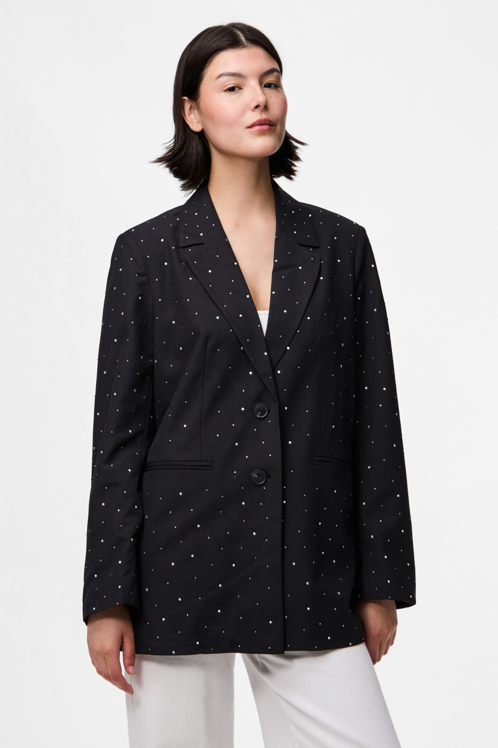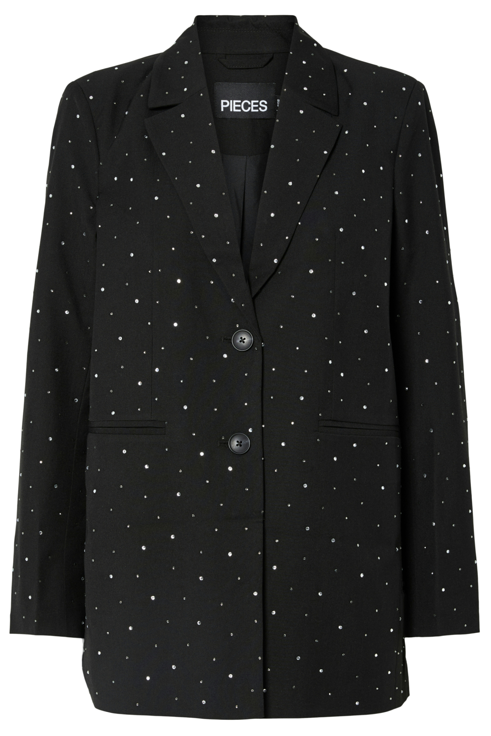 Deze elegante zwarte blazer van Pieces is een stijlvolle blikvanger voor je herfstgarderobe. Het patroon van subtiele strasssteentjes over de hele blazer geeft een verfijnde glans, waardoor je look net dat beetje extra krijgt. De regular fit zorgt ervoor dat je comfortabel en zelfverzekerd voor de dag komt, ongeacht de gelegenheid. Met lange mouwen en een klassiek reverskraagontwerp, straalt deze blazer een tijdloze elegantie uit die perfect is voor zowel casual als formelere settings. Gemaakt van een zachte mix van polyester, viscose en elastaan, biedt deze blazer zowel duurzaamheid als comfort. De paspelzakken voegen een verfijnde touch toe, terwijl de combinatie van knopen en een ritsluiting voor veelzijdigheid in styling zorgt. Deze blazer is niet alleen ideaal voor een avondje uit, maar ook geschikt voor zakelijke bijeenkomsten. Combineer hem met een casual jeans voor een relaxte look of een nette pantalon voor een meer formele uitstraling. Hoe je hem ook draagt, met deze Pieces blazer maak je altijd een elegante indruk.