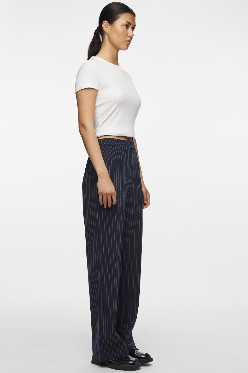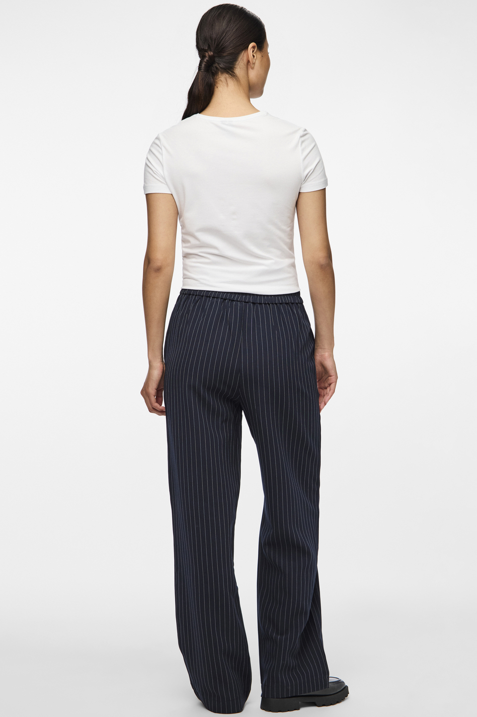 Deze Sky Captain/PINSTRIPE broek van Pieces is een stijlvolle keuze voor elke dag. Met een high waist en een elastische boord, biedt deze broek zowel comfort als een trendy silhouet. De wide leg pasvorm geeft een moderne twist en creëert een soepel en flatterend effect. Het subtiele streeppatroon maakt het ontwerp tijdloos en veelzijdig, perfect om te combineren met een basic top voor een casual look of met een blouse voor een meer geklede uitstraling. Met zijn normale lengte en praktische steekzakken is deze broek zowel functioneel als modieus. Het ontwerp is ideaal voor een dag op kantoor, een ontspannen brunch met vrienden, of een middagje shoppen. Dankzij de duurzame materiaalkeuze draag je niet alleen iets stijlvols, maar maak je ook een bewuste keuze. Deze broek van Pieces past naadloos in je dagelijkse garderobe, of je nu kiest voor een elegante of relaxte outfit.